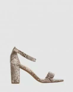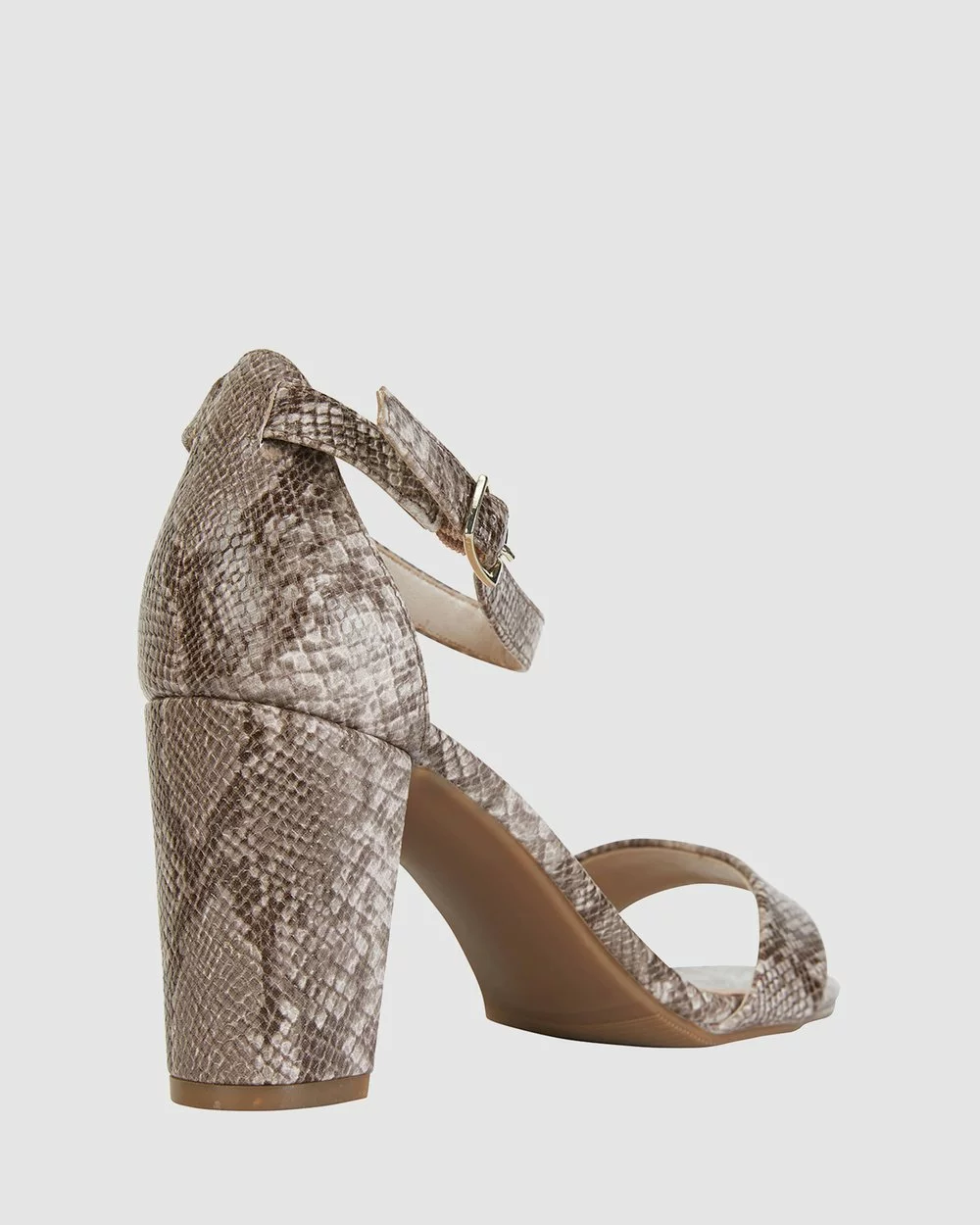 – Approx 80mm heel height- Snake print upper shade- Block heel for added comfort & stability- Buckle detailing on ankle strap