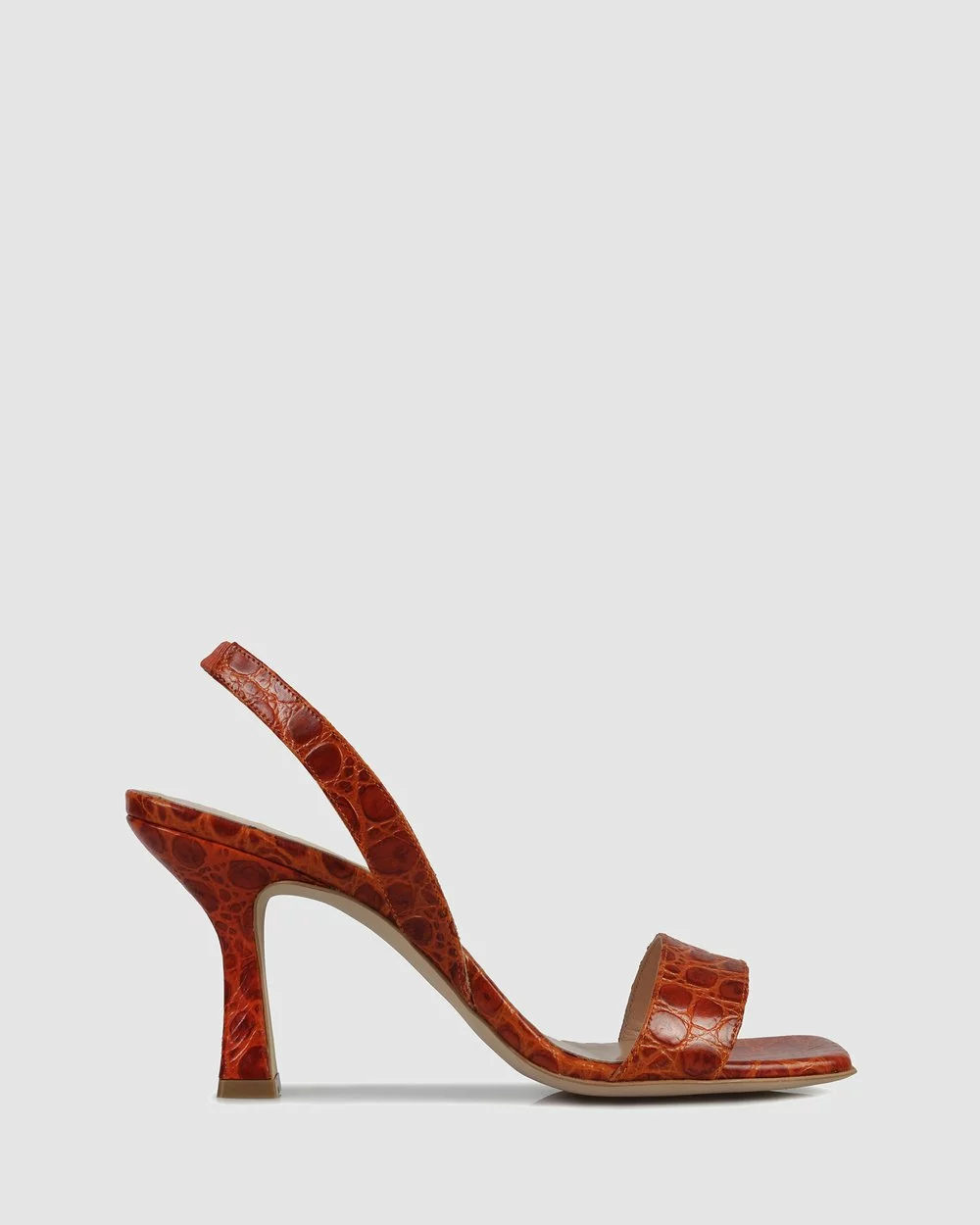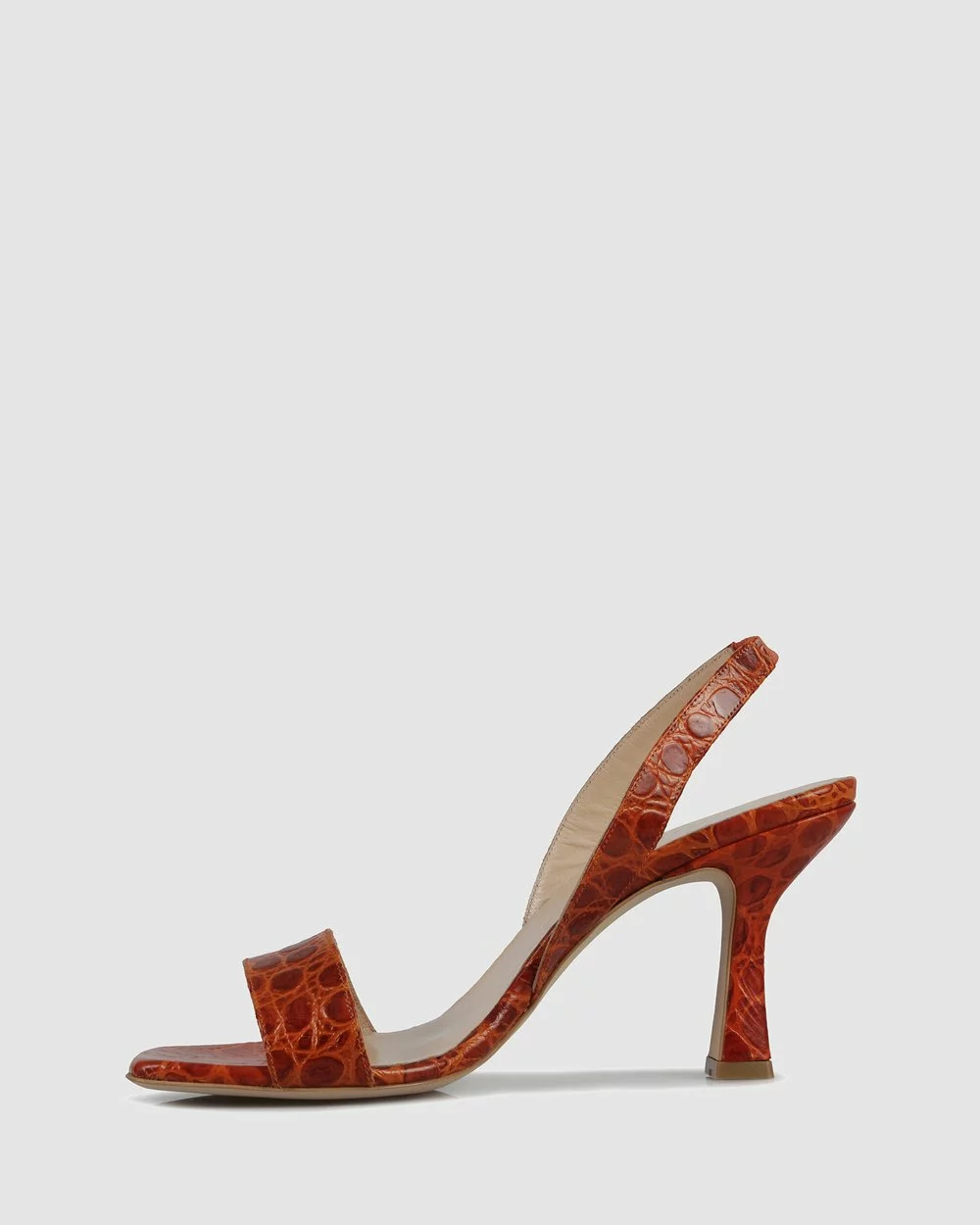Supercharge your new-season occasion wear with the Miyoko Heels by Sempre Di. Clean and minimal with a single upper strap across the toes, and a Slingback strap around the ankle. A tall, flared heel adds elegant curves while faux croc brings appealing texture. Serve a dose of slinky glamour at your next soiree. – Leather upper – Black or orange – Single upper strap – Slingback ankle strap – Open toe – Open heel – Leather upper – Inner: Leather – Sole: NEOLITE.