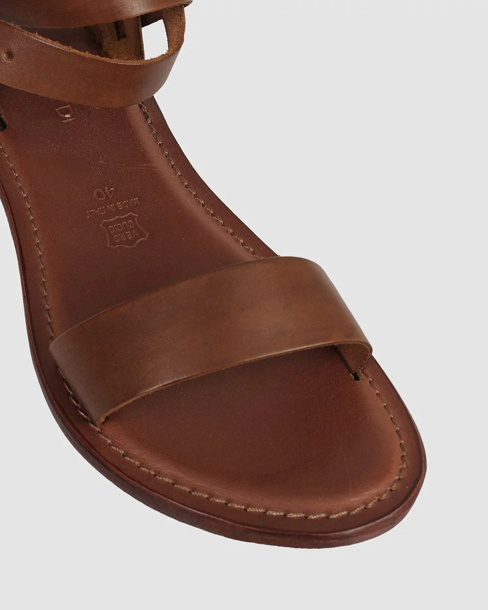 simplicity approach to dressing. These flats are crafted with a single front strap and paired with two buckle ankle straps with adjustable buckles for support. Set on a round toe shape and super flat leather sole. The Rania flat all leather sandals made in Italy are the quintessential to any summer wardrobe. Available in tan or black.