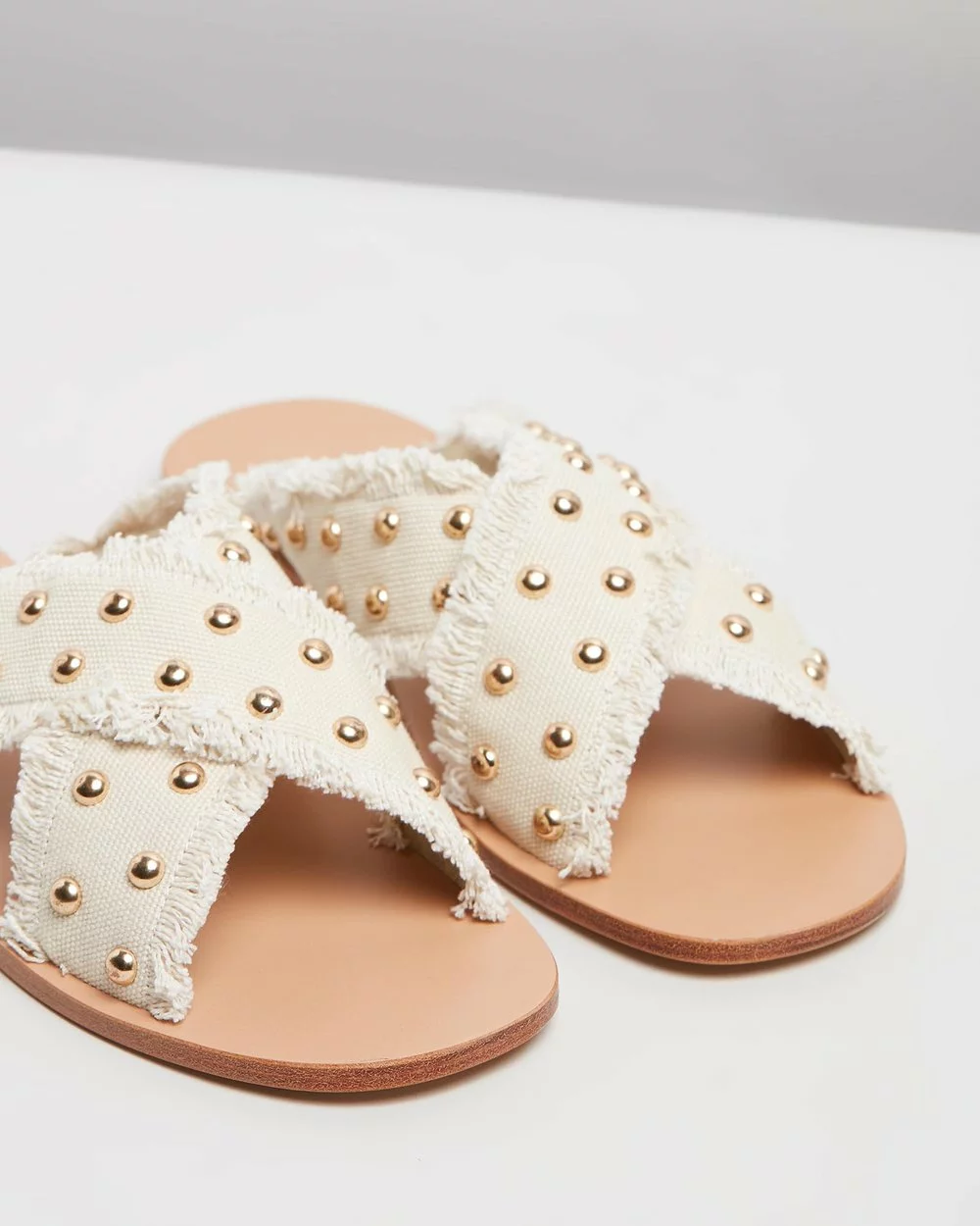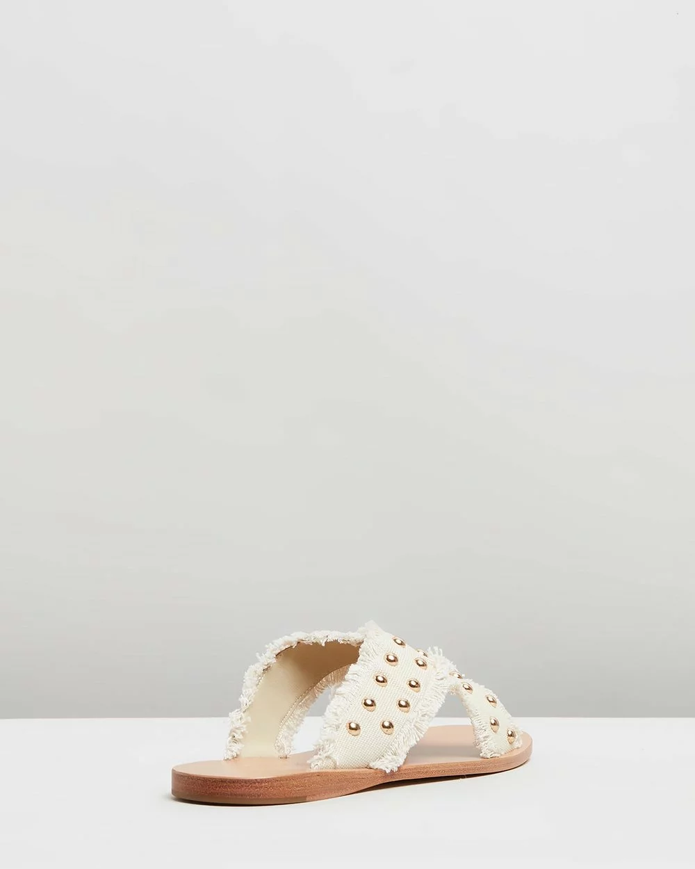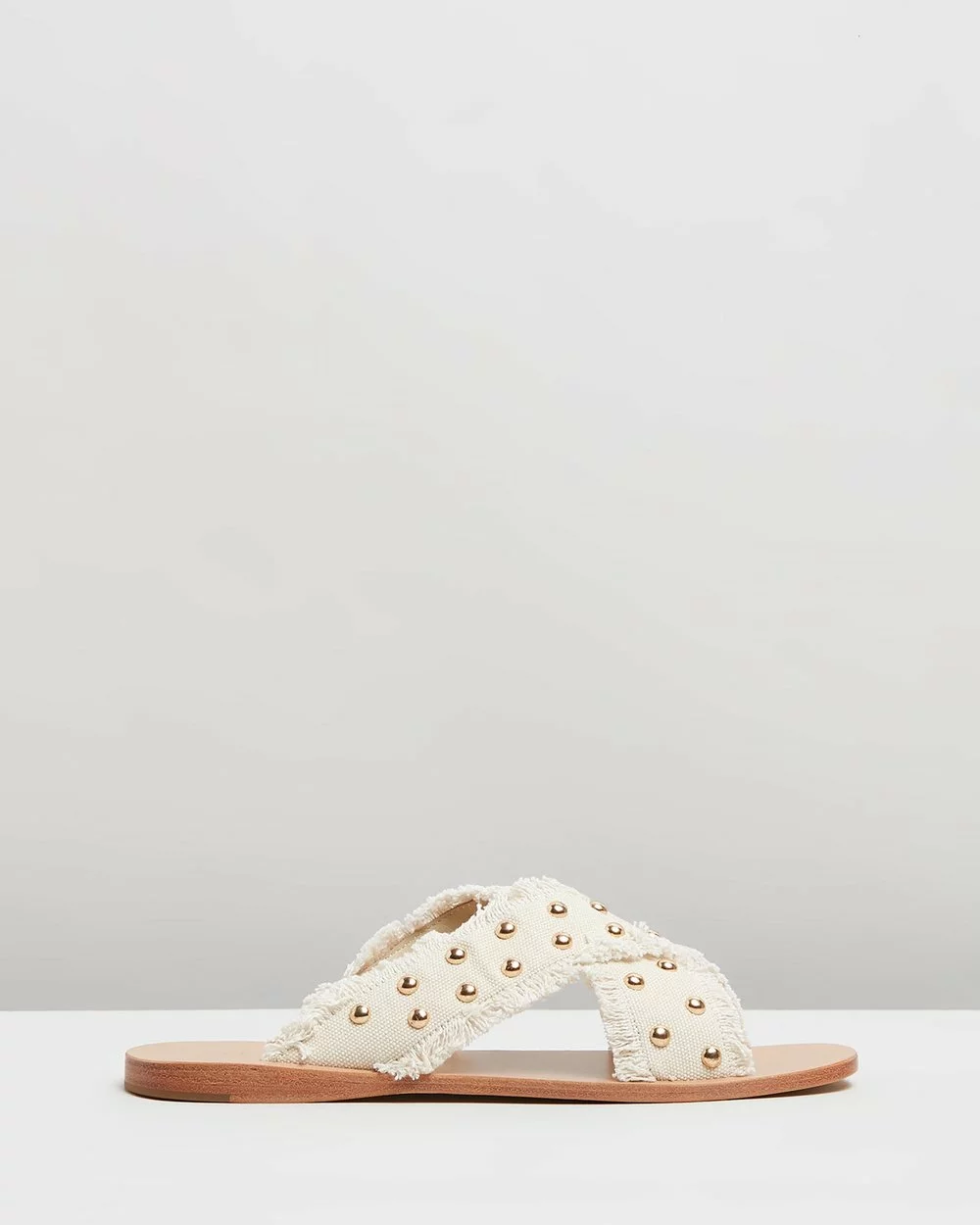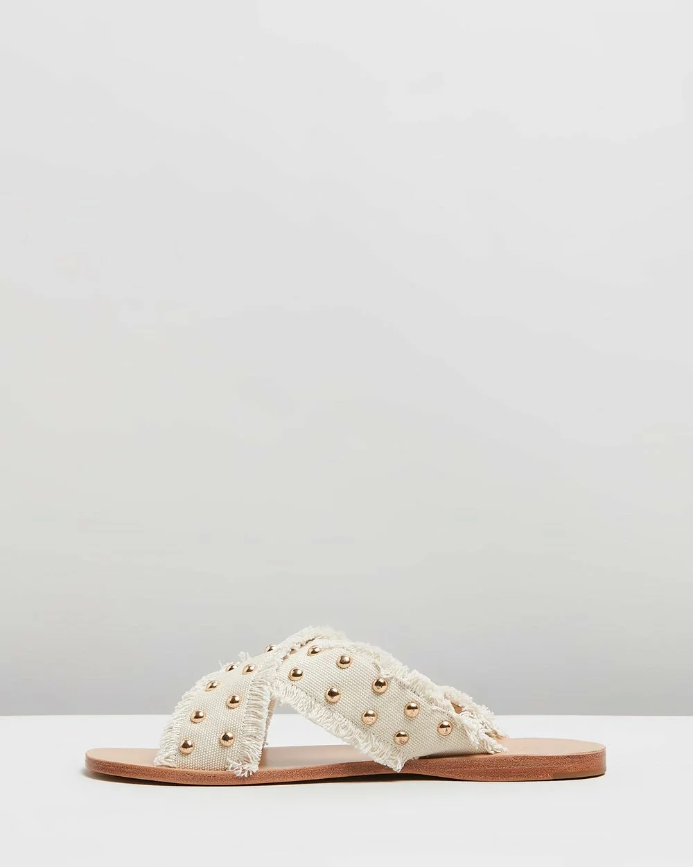 The Belle slides from Senso boast a fringed canvas cross-strap upper artfully embellished with gold-toned studs for a textural twist on weekend casual.