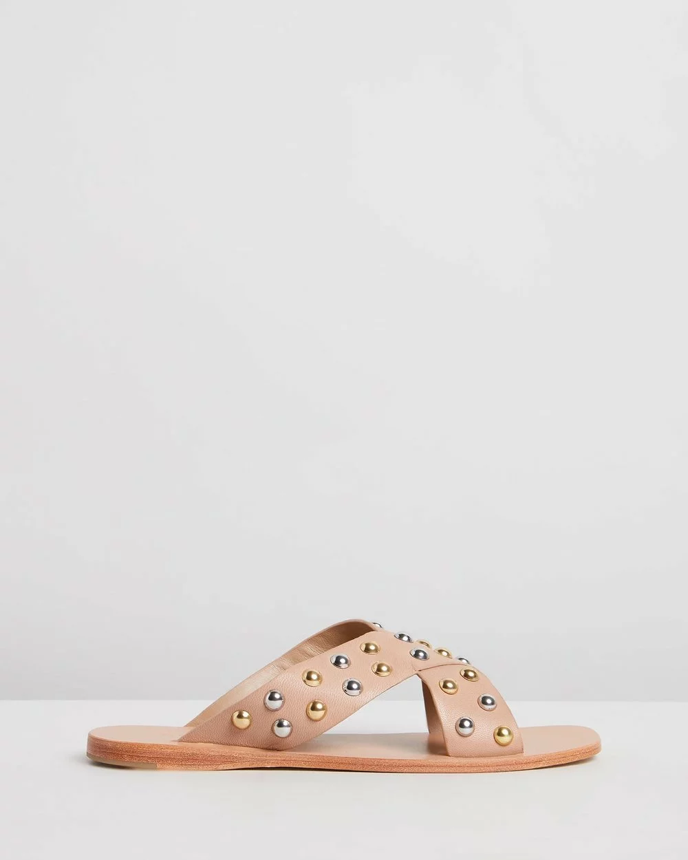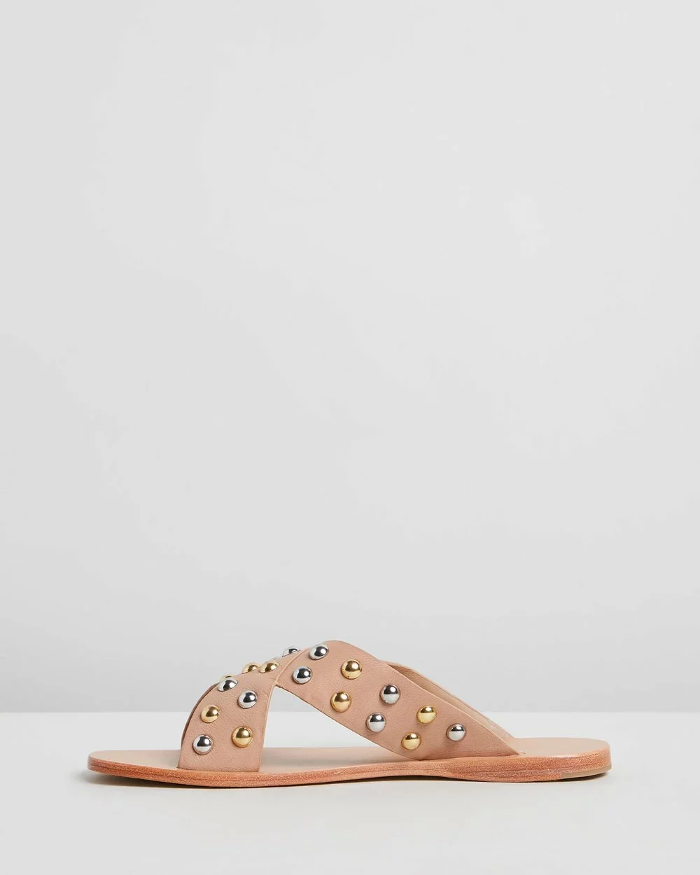 – Cross-over vamp strap with gold-toned and silver-toned stud embellishment