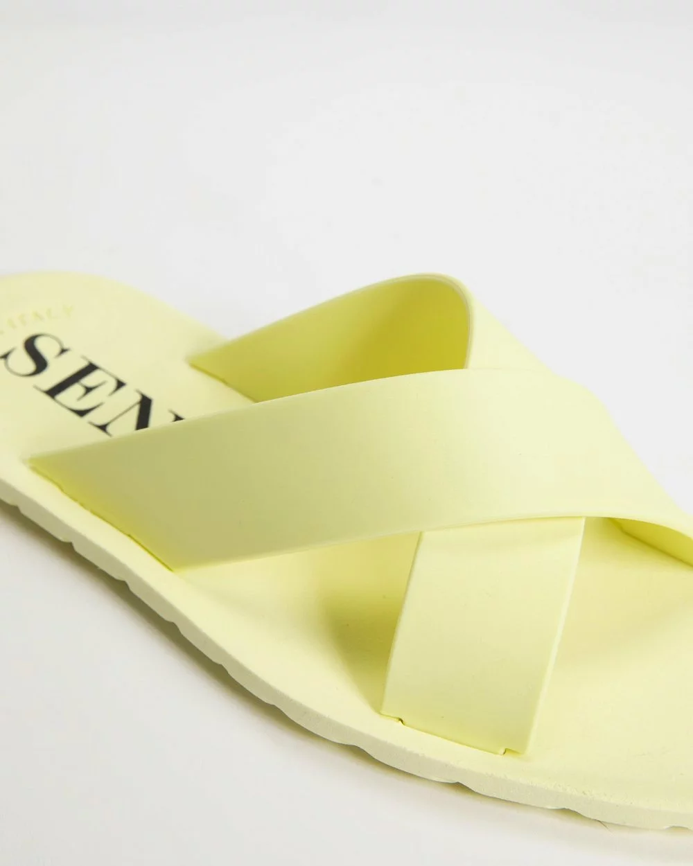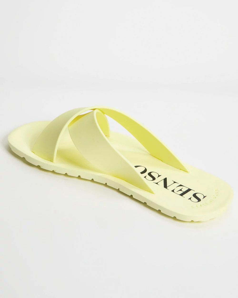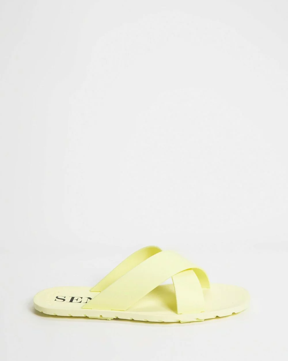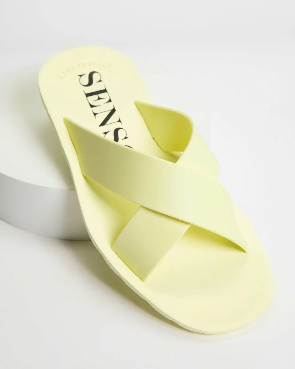 Slide into the Italian-made Frankie slides in a zesty yellow for a resort-come-runway feel to tread brunch and beyond by Australian footwear favourite Senso.