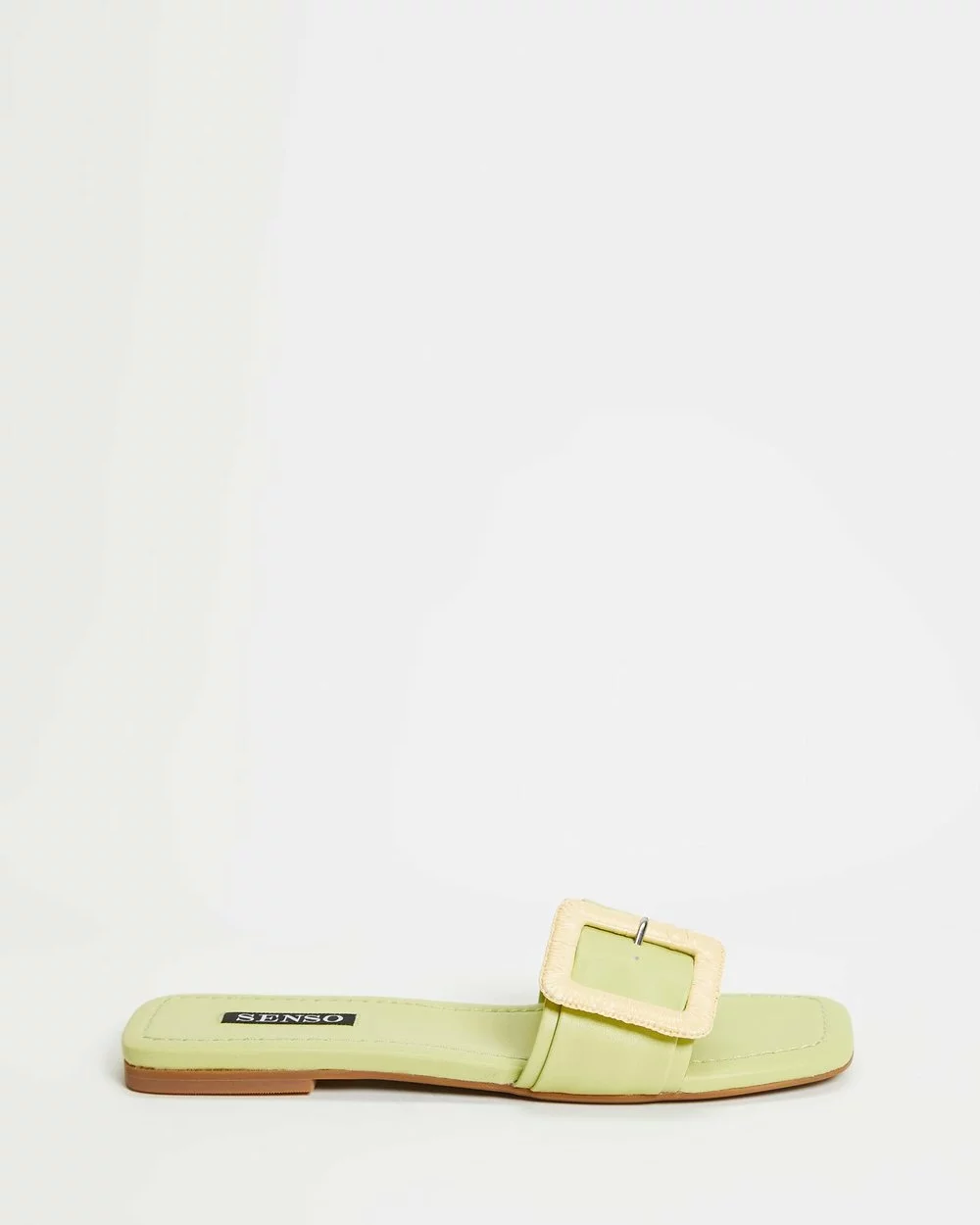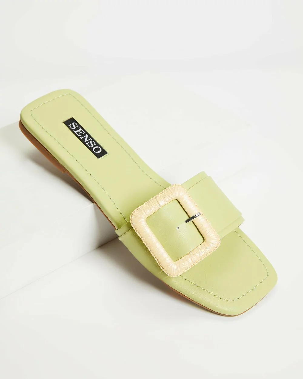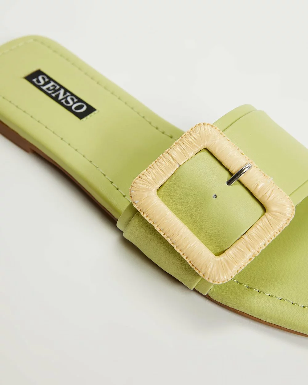 Realising the uncomplicated air of summertime laissez-faire with every step is Senso‘s lime green Hart II slides, constructed in genuine leather and embellished with a faux rattan buckling to smoothened vamp.