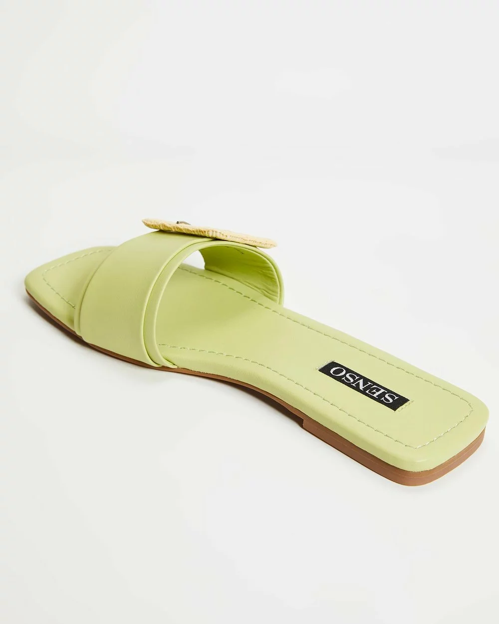 – Wide vamp with rattan faux buckle