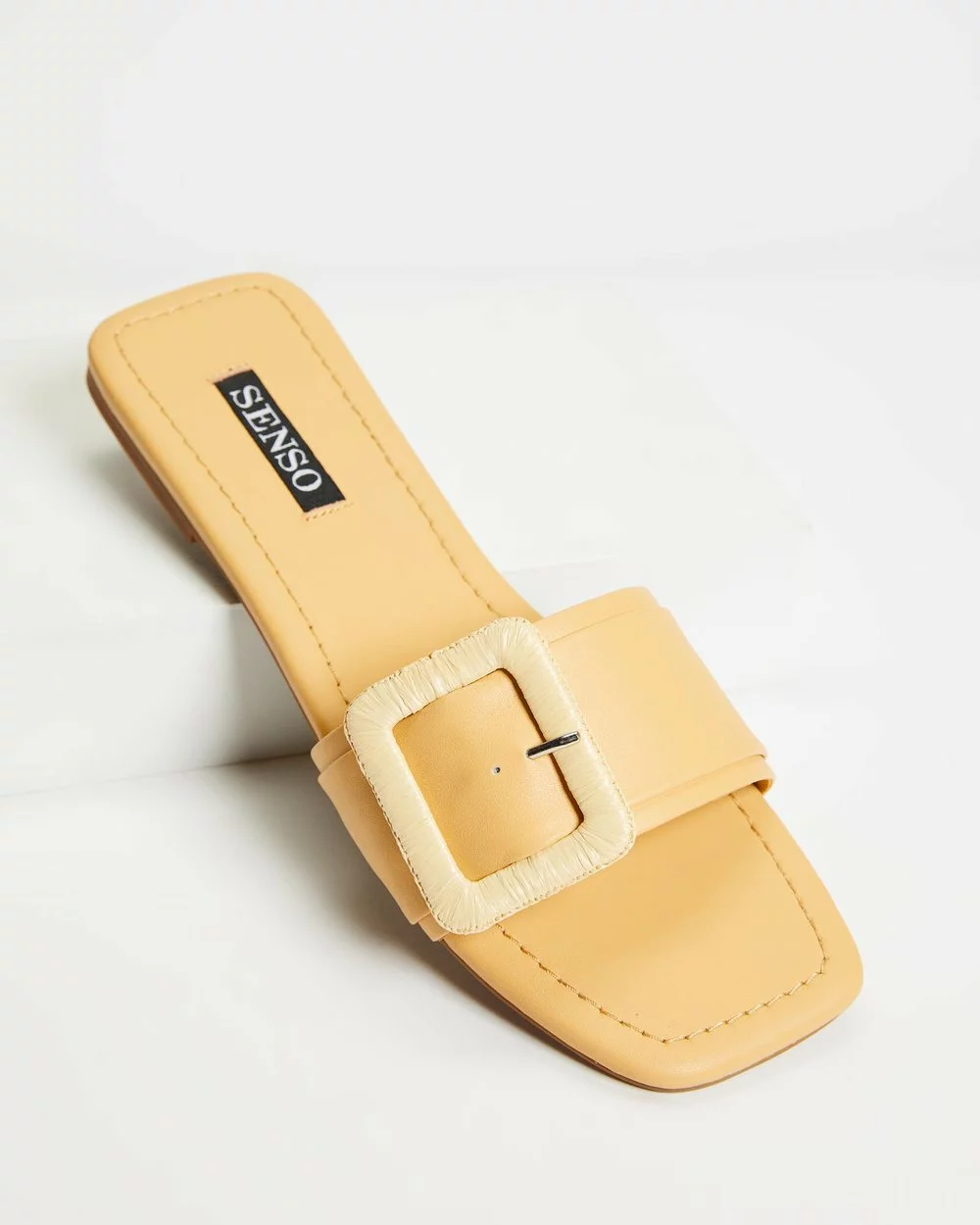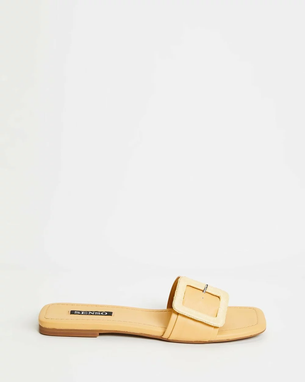 Realising the uncomplicated air of summertime laissez-faire with every step is Senso‘s zest yellow Hart II slides, constructed in genuine leather and embellished with a faux rattan buckling to smoothened vamp.