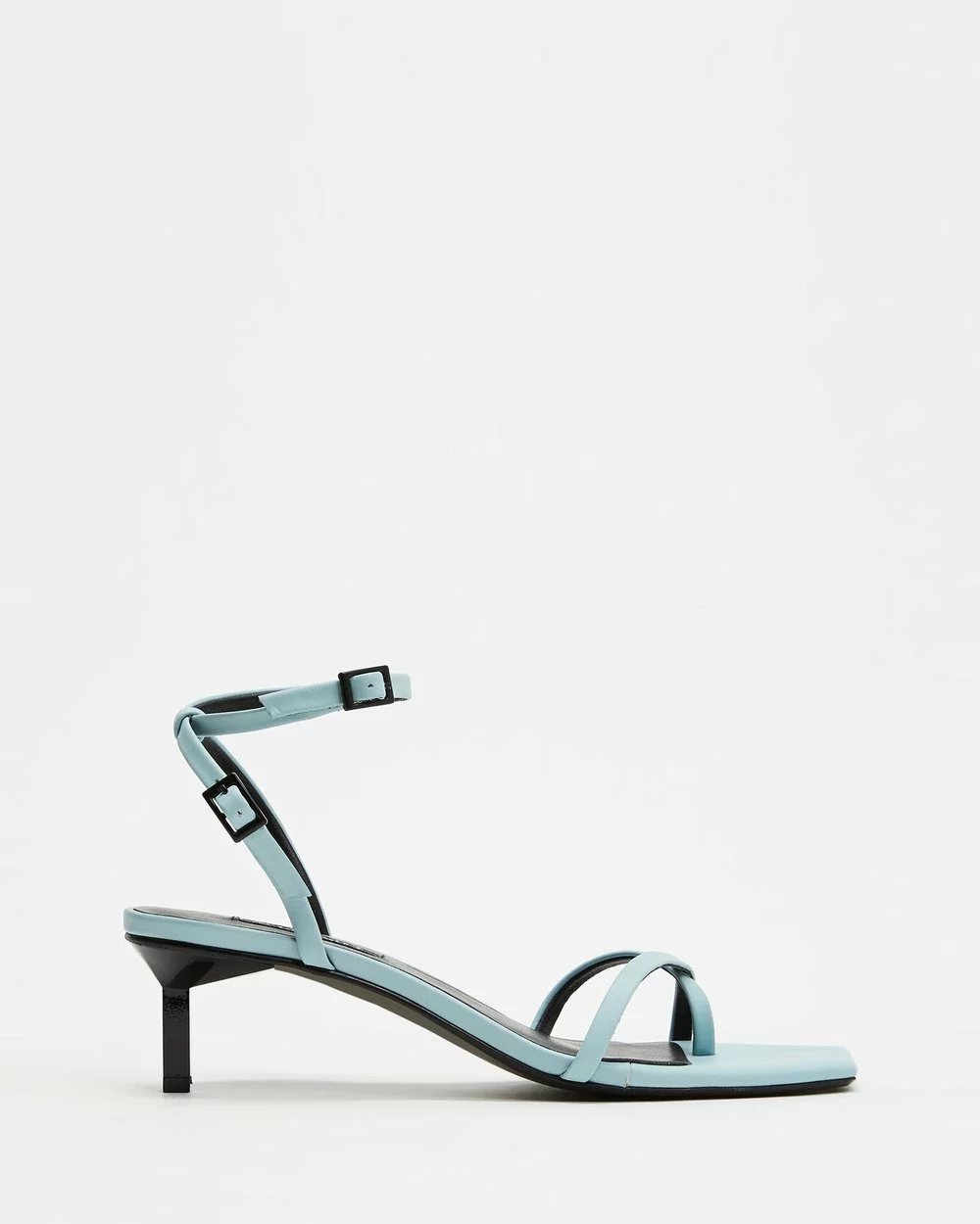 – Squared toe; adjustable buckle strap fastening; 6cm spool heel