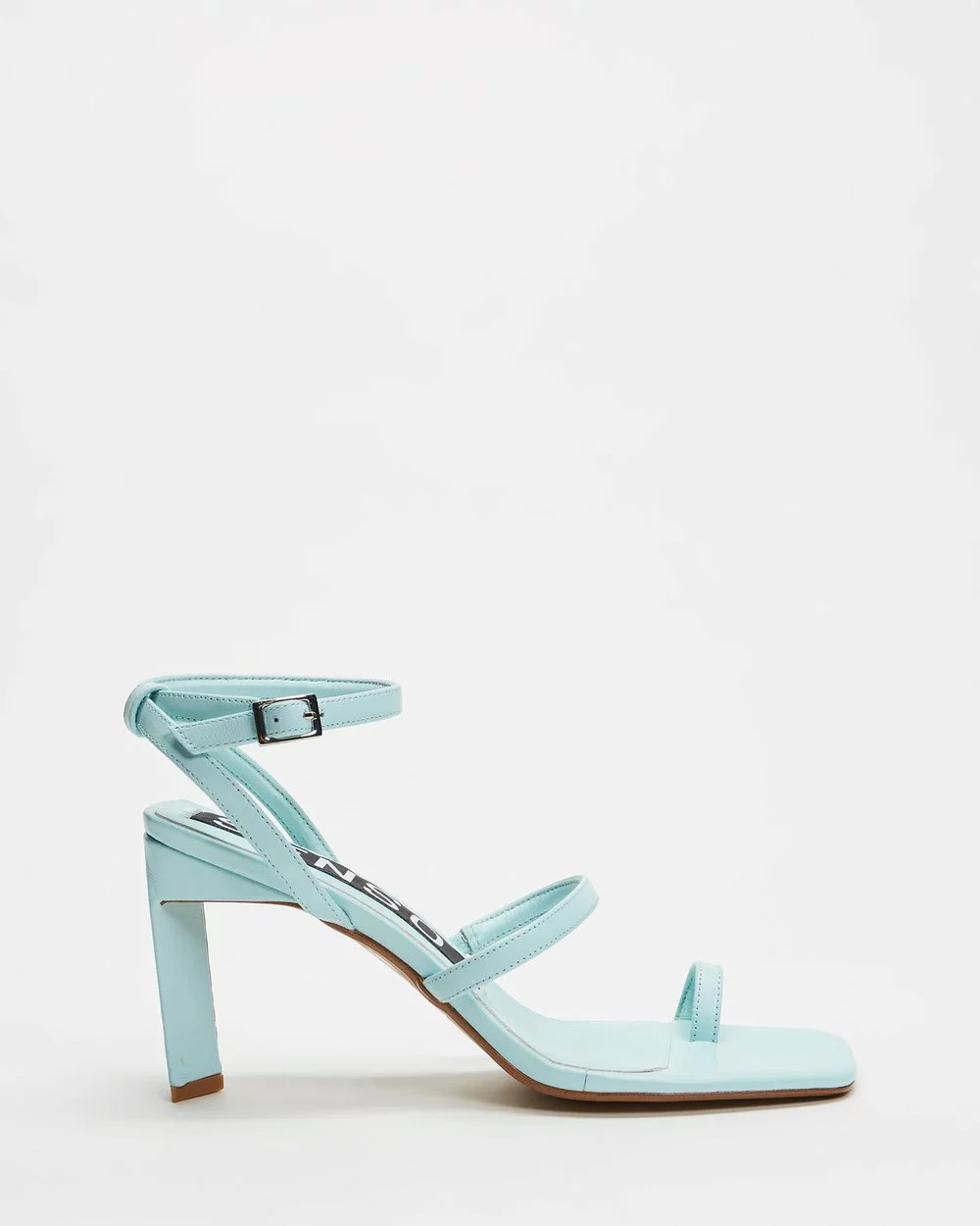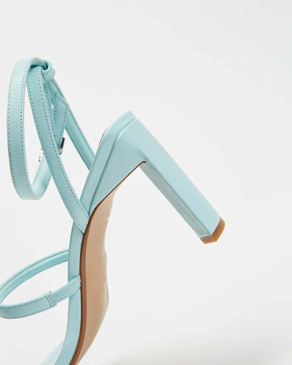 – Square toe; buckle ankle strap fastening; 8.5cm angular heel