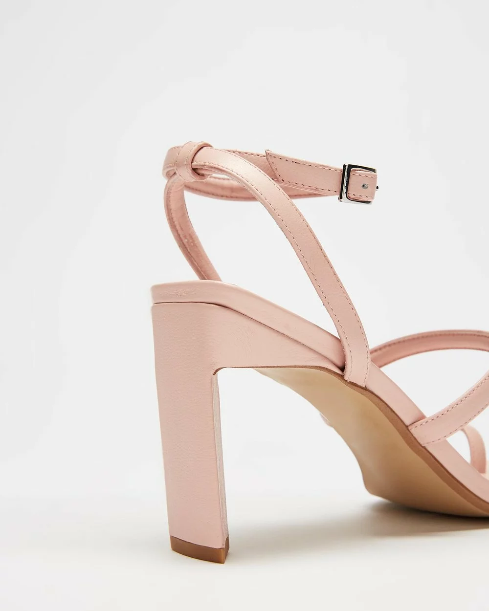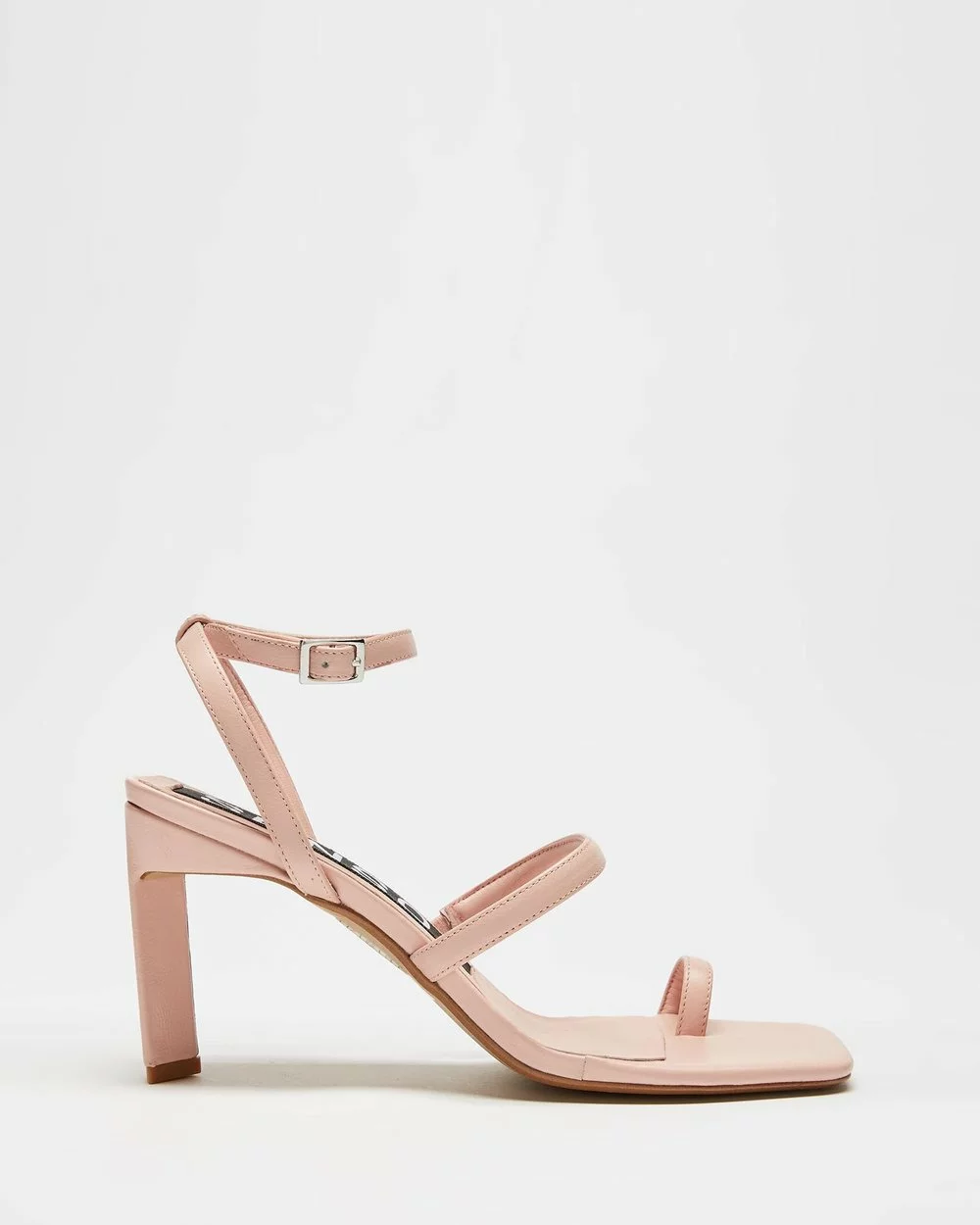 – Square toe; buckle ankle strap fastening; 8.5cm angular heel