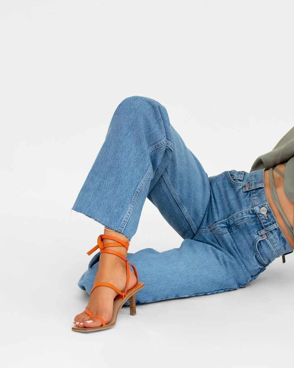 – Thong-style toe post; wrap-around ankle ties