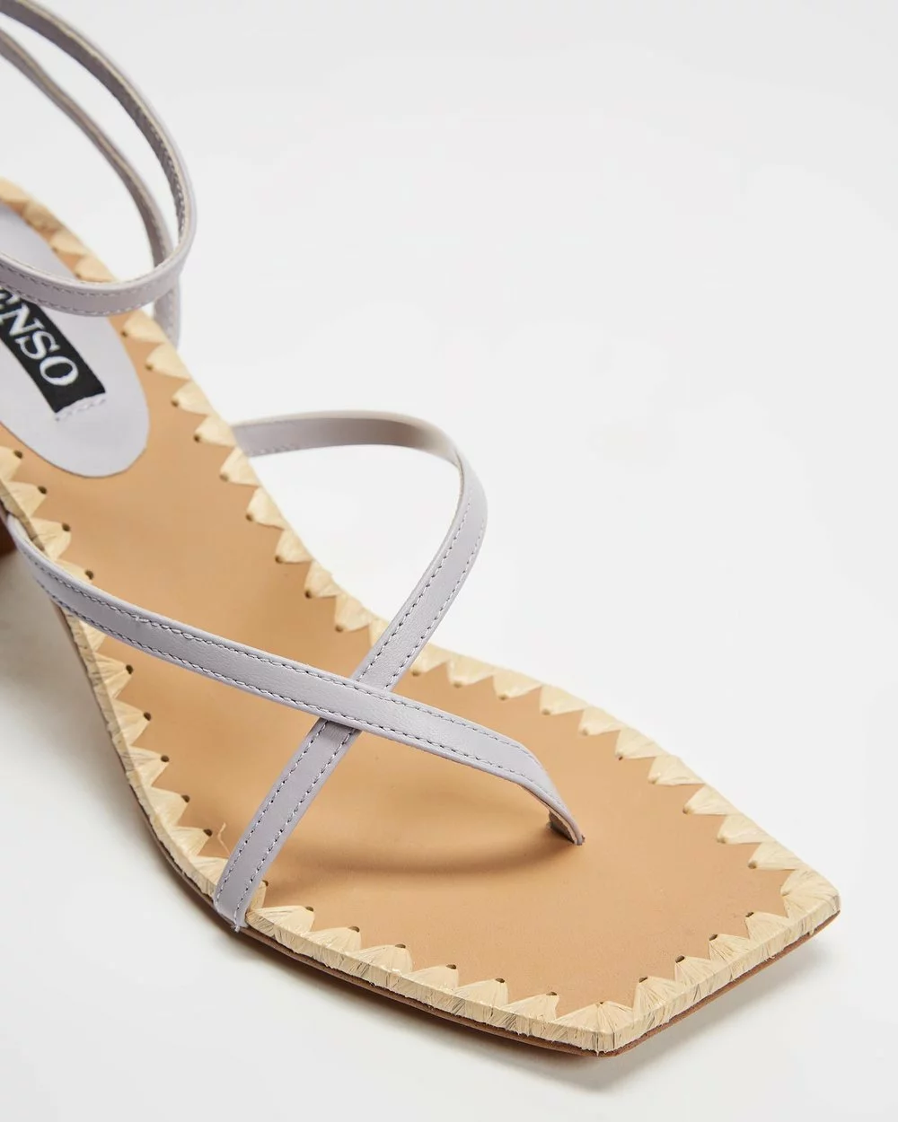 – Open toe; squared with woven welting; cross-strapping through ankle and vamp