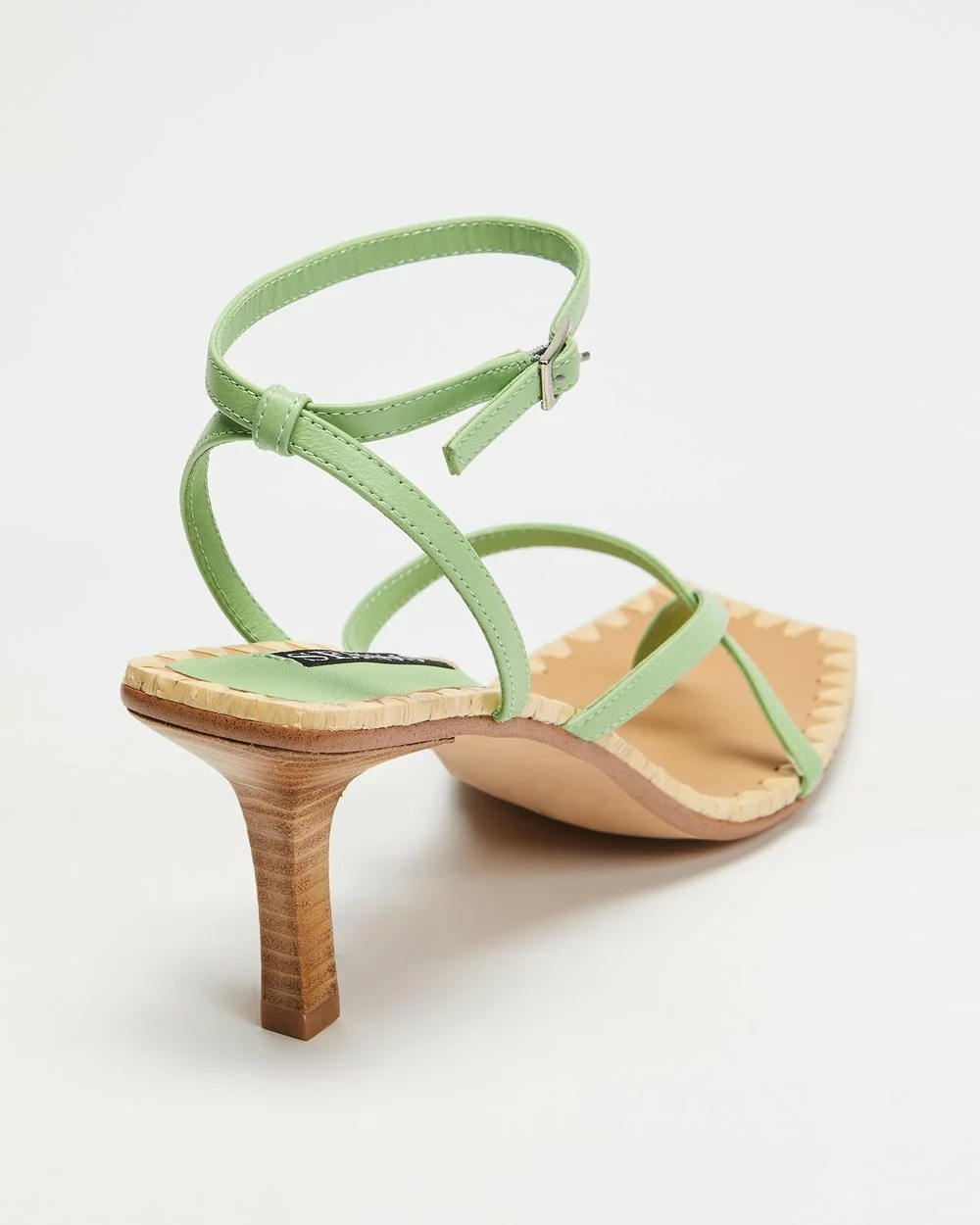 – Open toe; squared with woven welting; cross-strapping through ankle and vamp