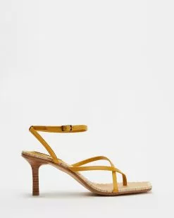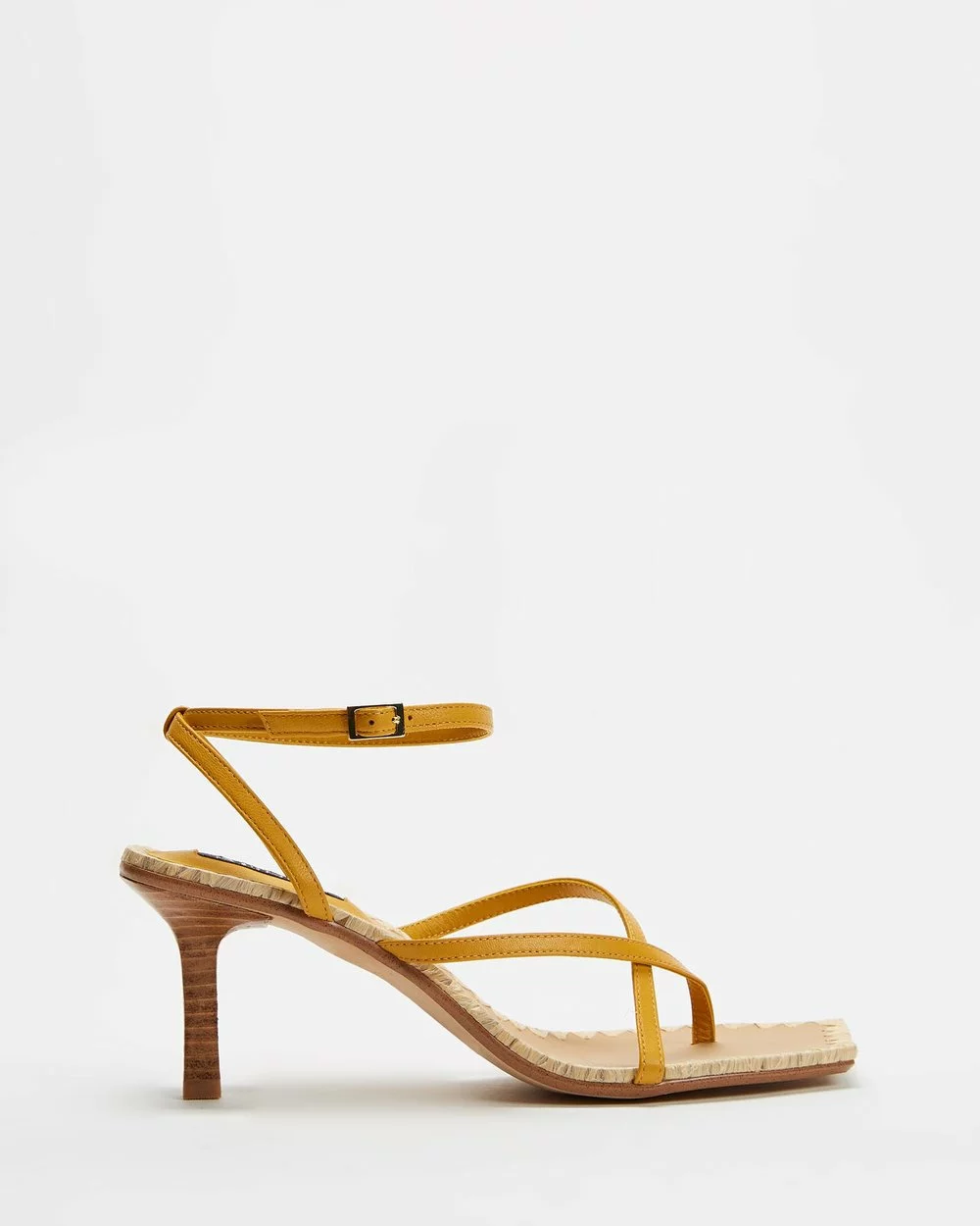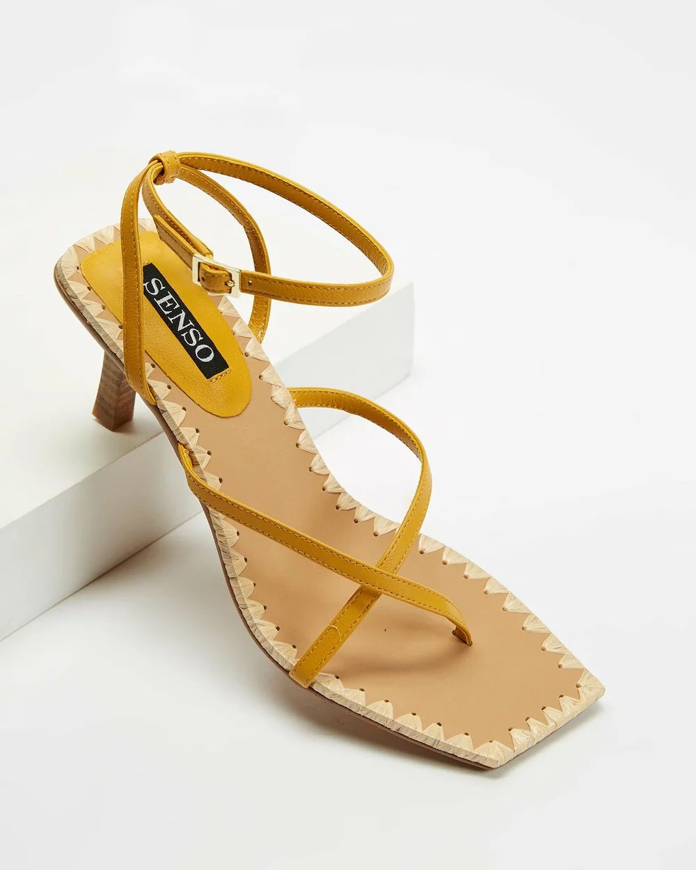 – Open toe; squared with woven welting; cross-strapping through ankle and vamp