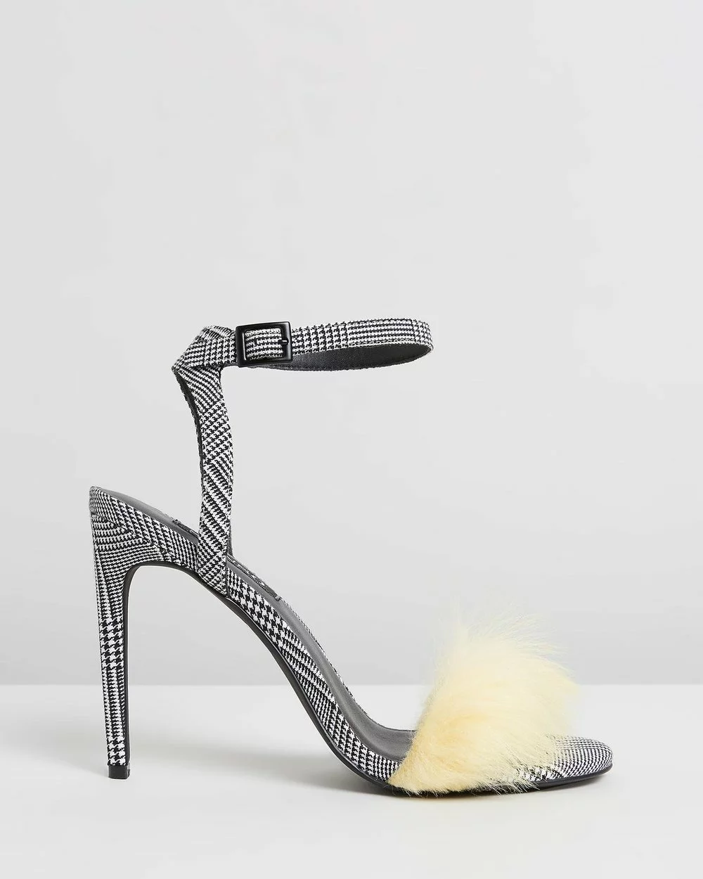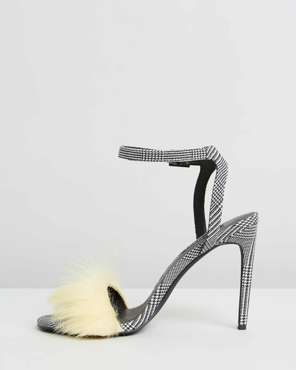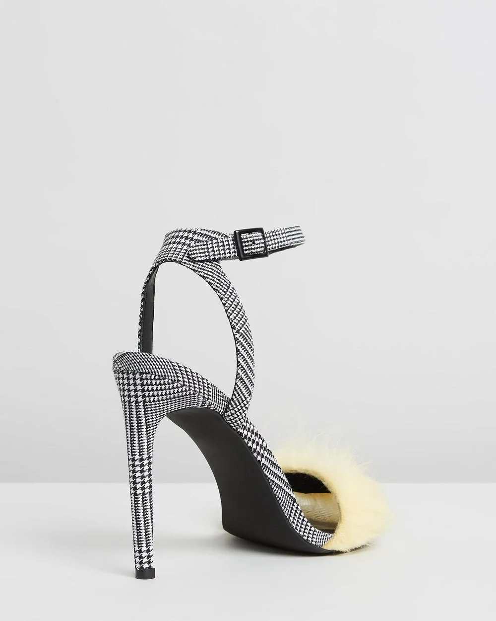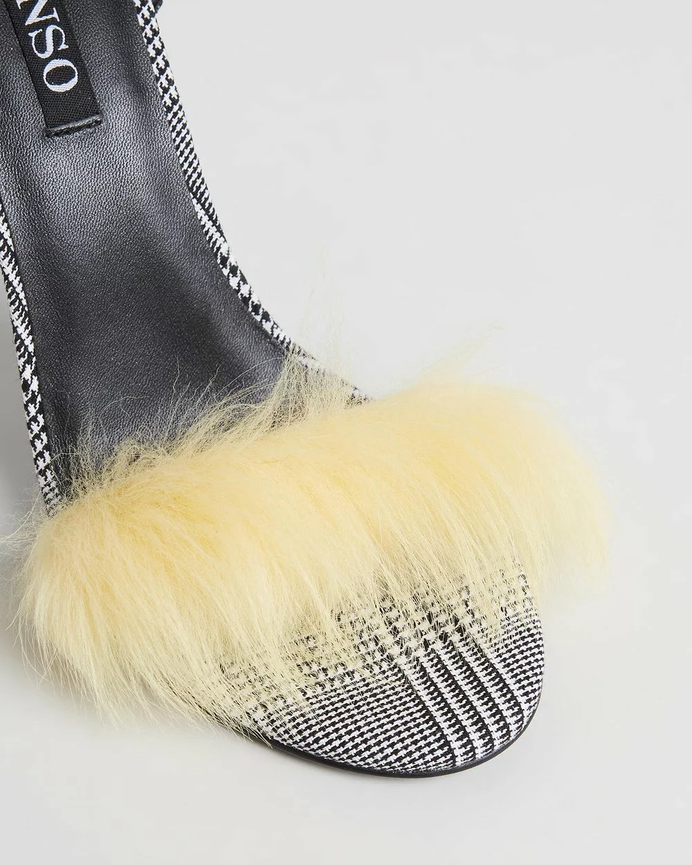 The Ophelia III heels by Senso are defined by its heritage-inflected houndstooth pattern, sheepskin fur toe strap and 11cm stiletto heel.