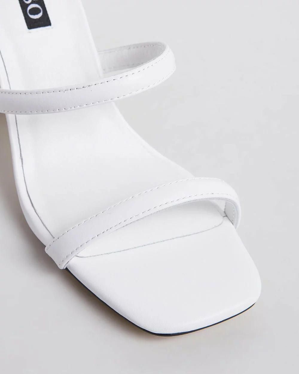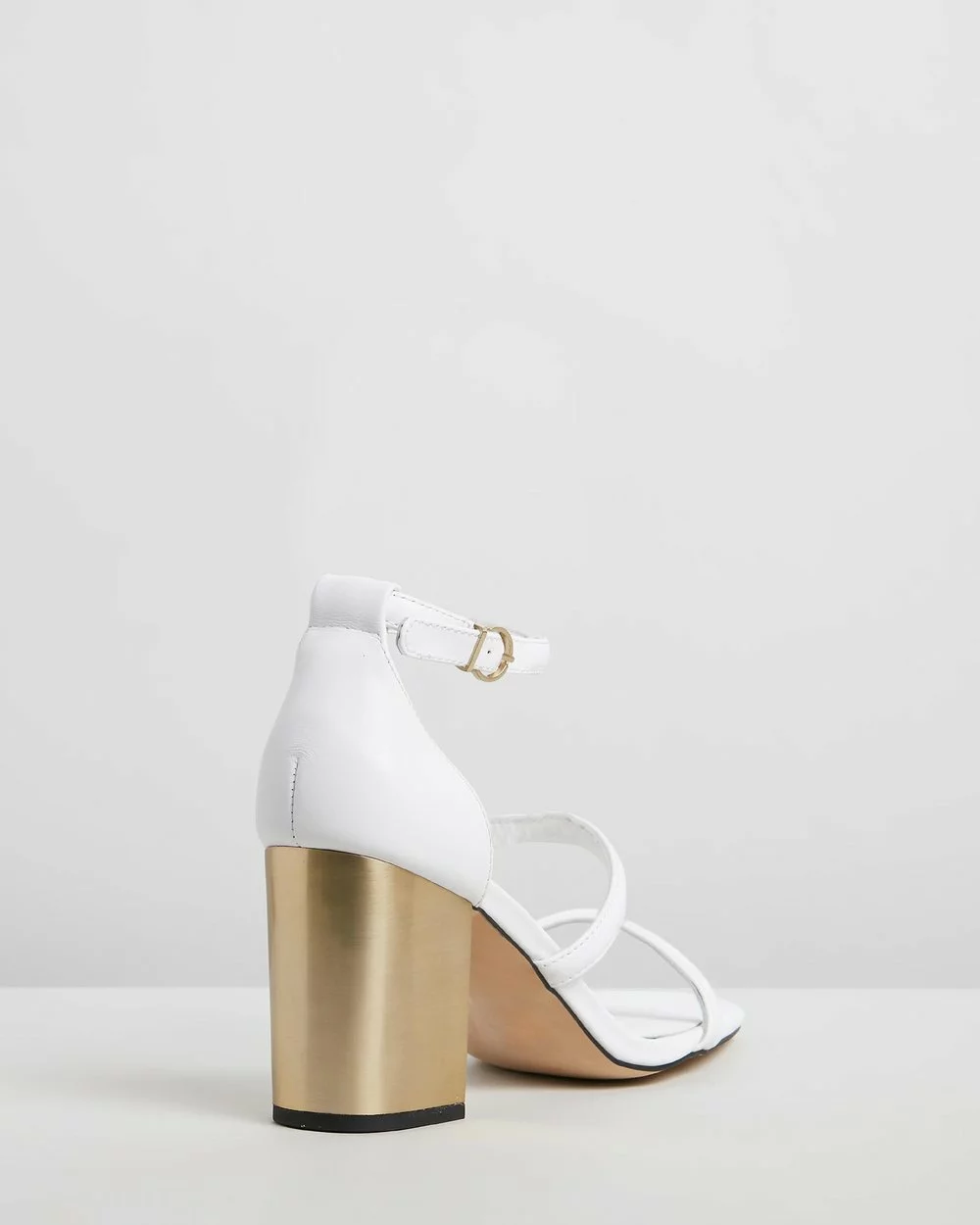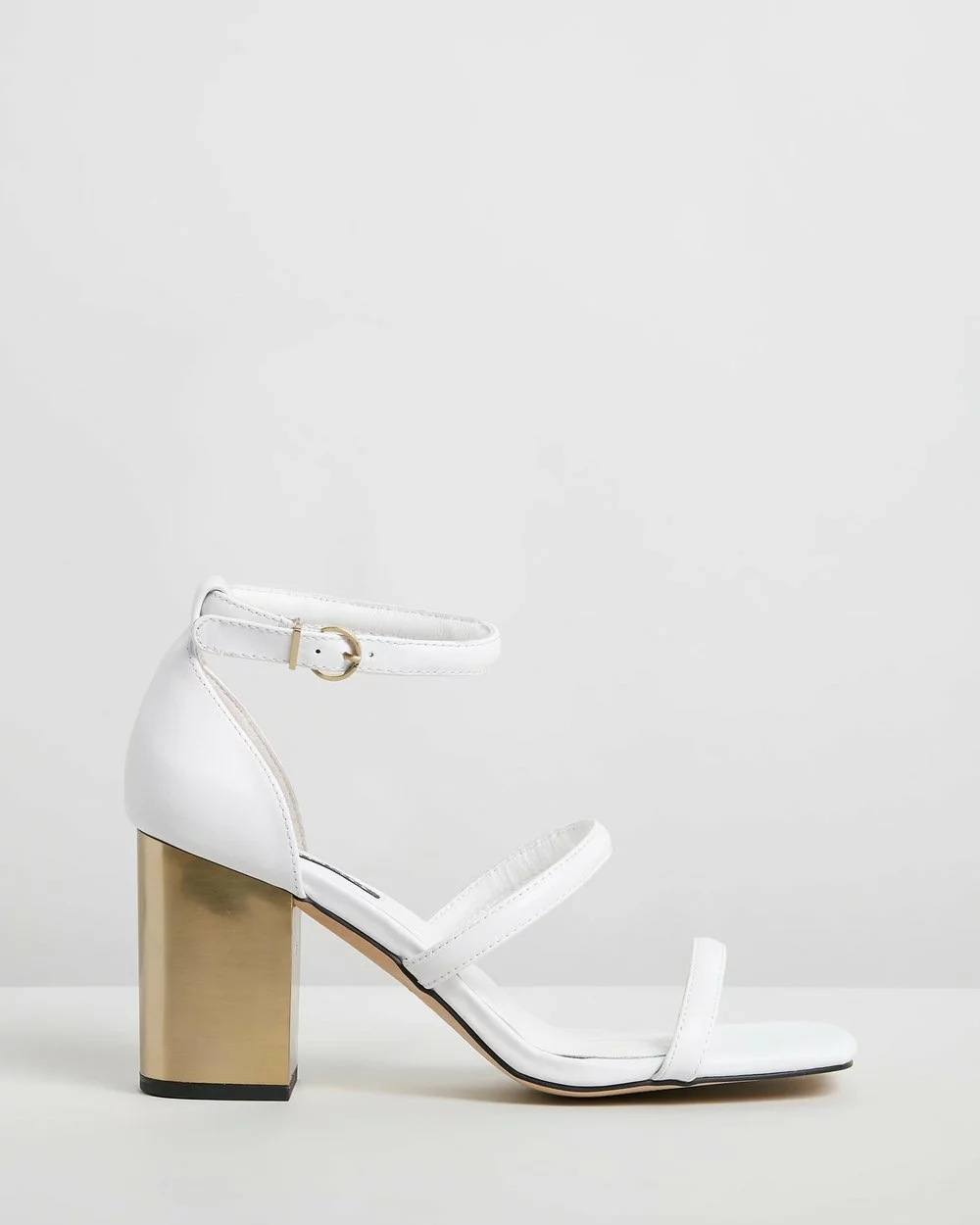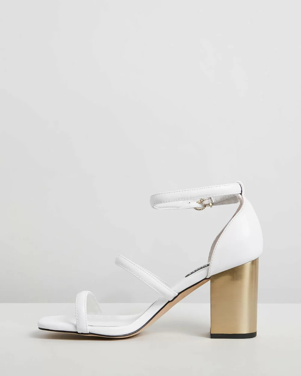 The Robbie III by Senso are defined by its striking gold-toned block heel and of-the-moment optic white hue.