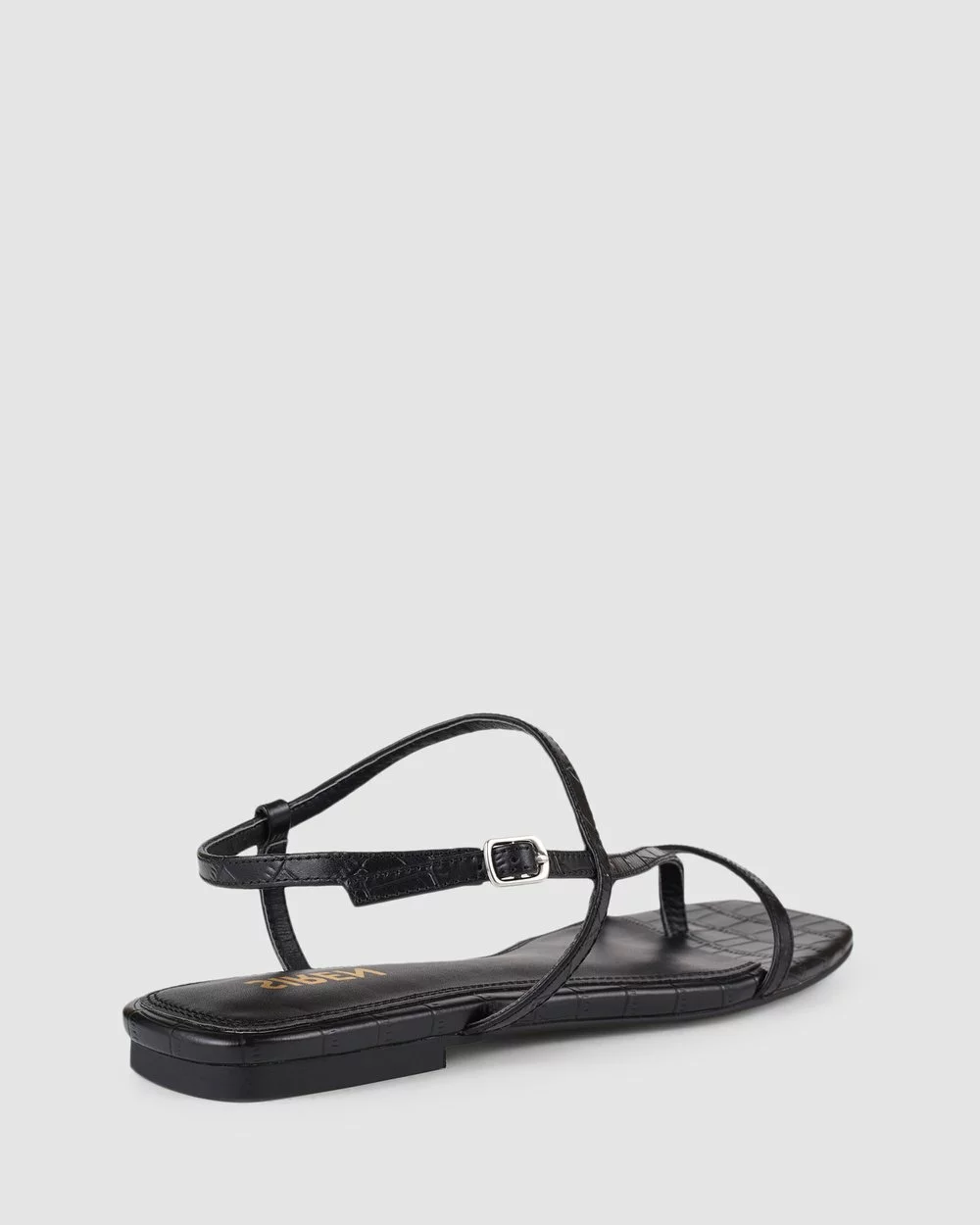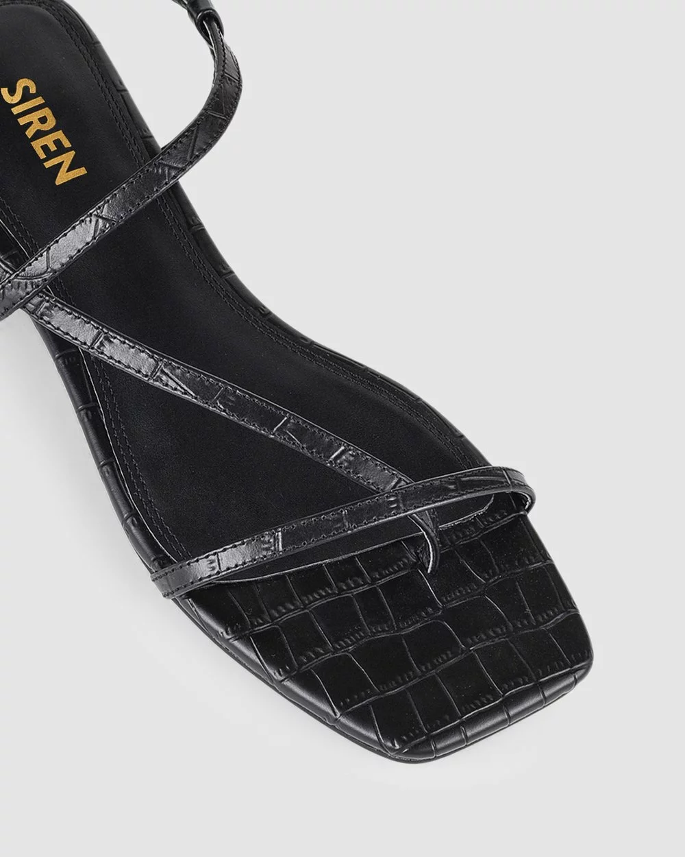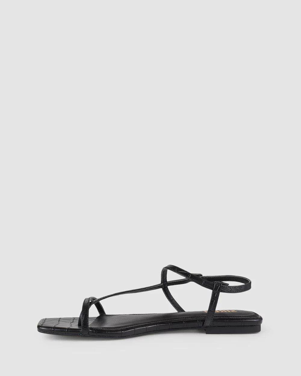 Features: Croc print embossed leather, small metal buckle fastening, slimline straps & squared toe shape.