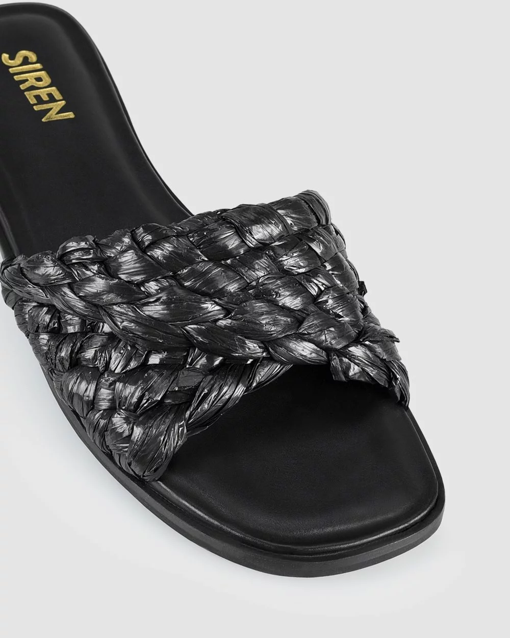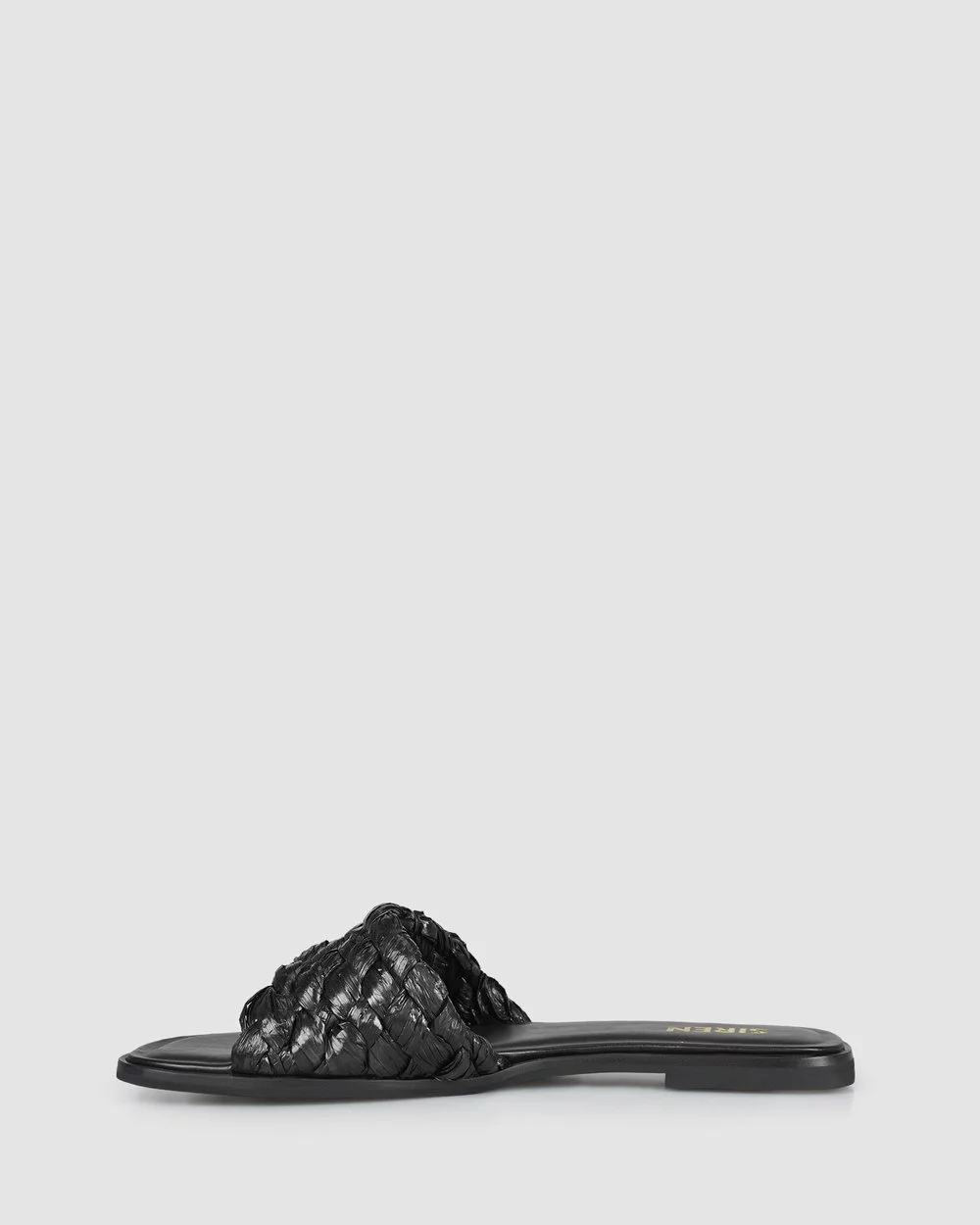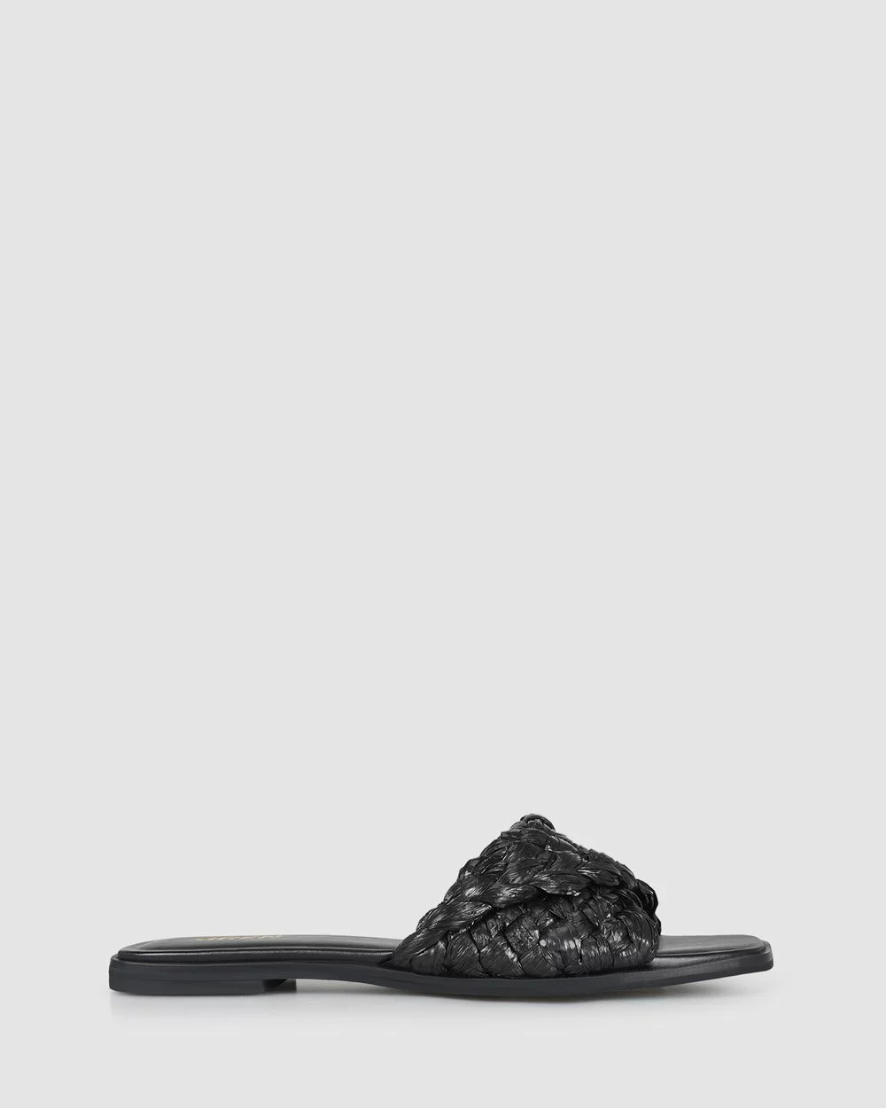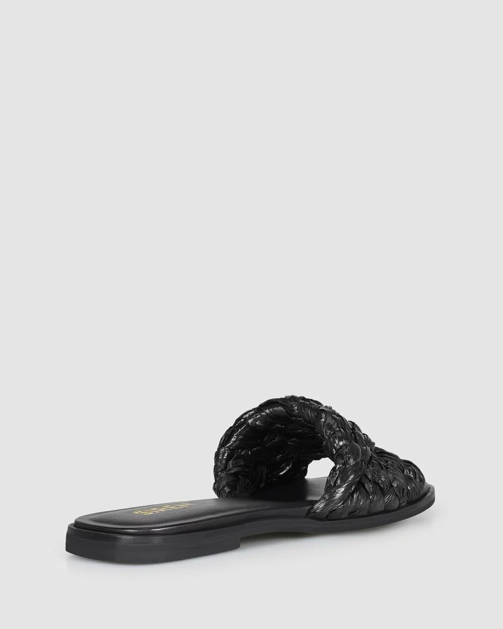 – Features: Cushioned insole, raffia woven upper with twist design, angular toe shape.