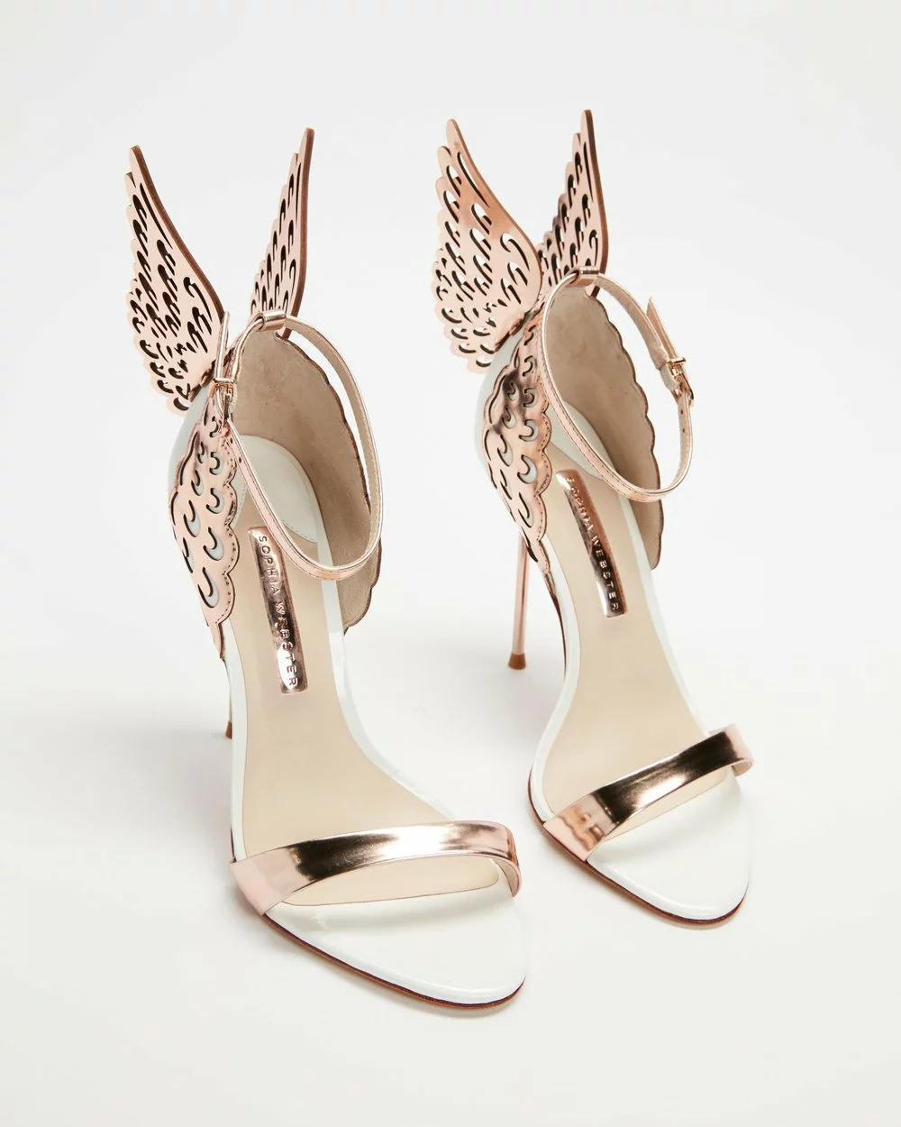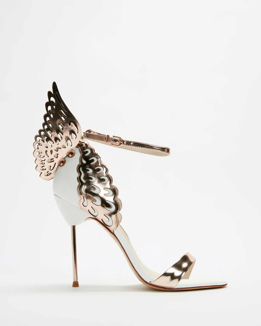 Bring an artful touch to your footwear edit with Sophia Webster shoes. Finished in a decadent rose gold tone, the show-stopping Evangeline Sandal Heels are bound to become the focal point of your next party-ready ensemble, fixed with sparkling angelic wings.
