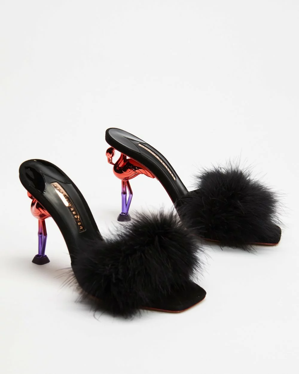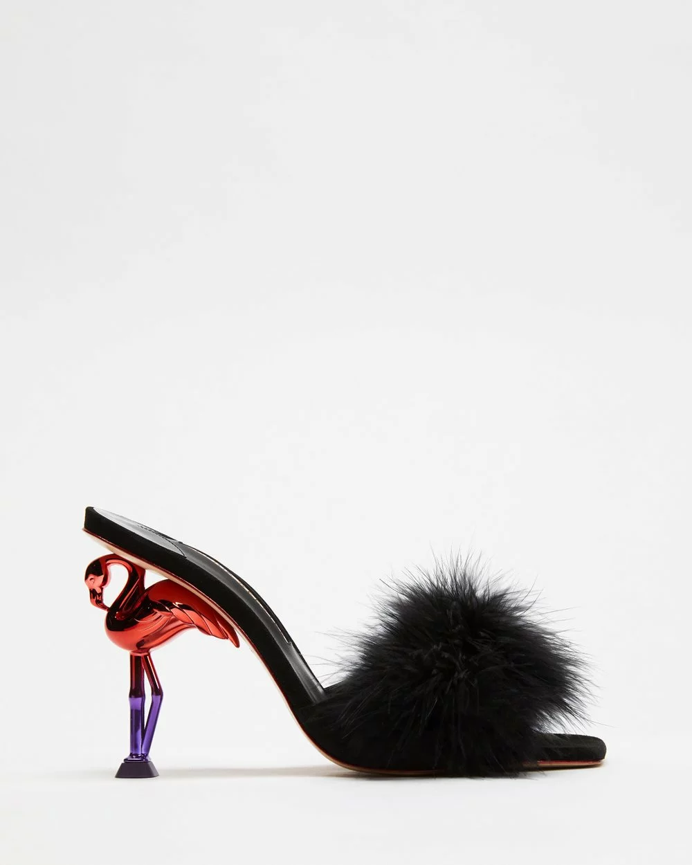 – Suede upper; fluffy marabou feather vamp strap