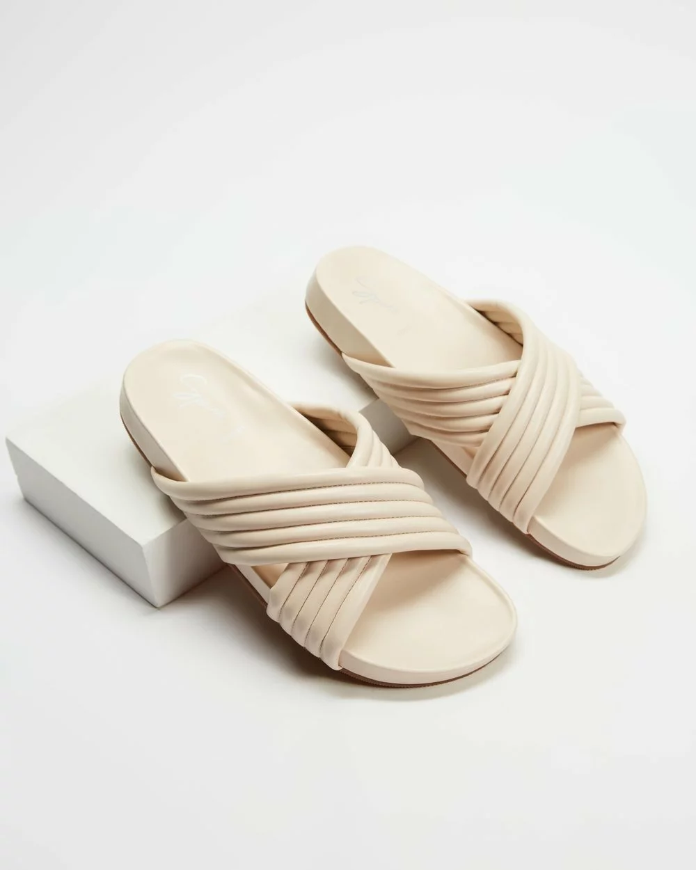 – Quilted faux-leather X-strap vamp