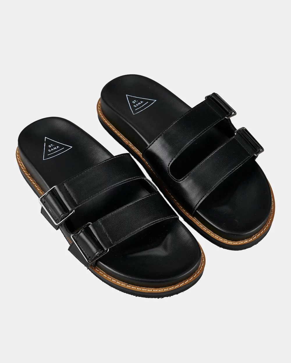– Leather-look upper; twin straps; buckle detail