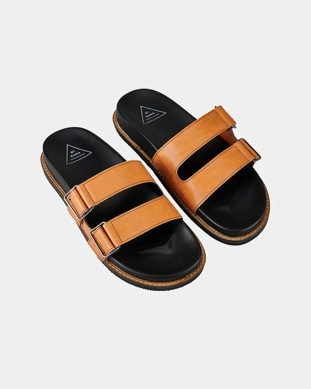 – Leather-look upper; twin straps; buckle detail