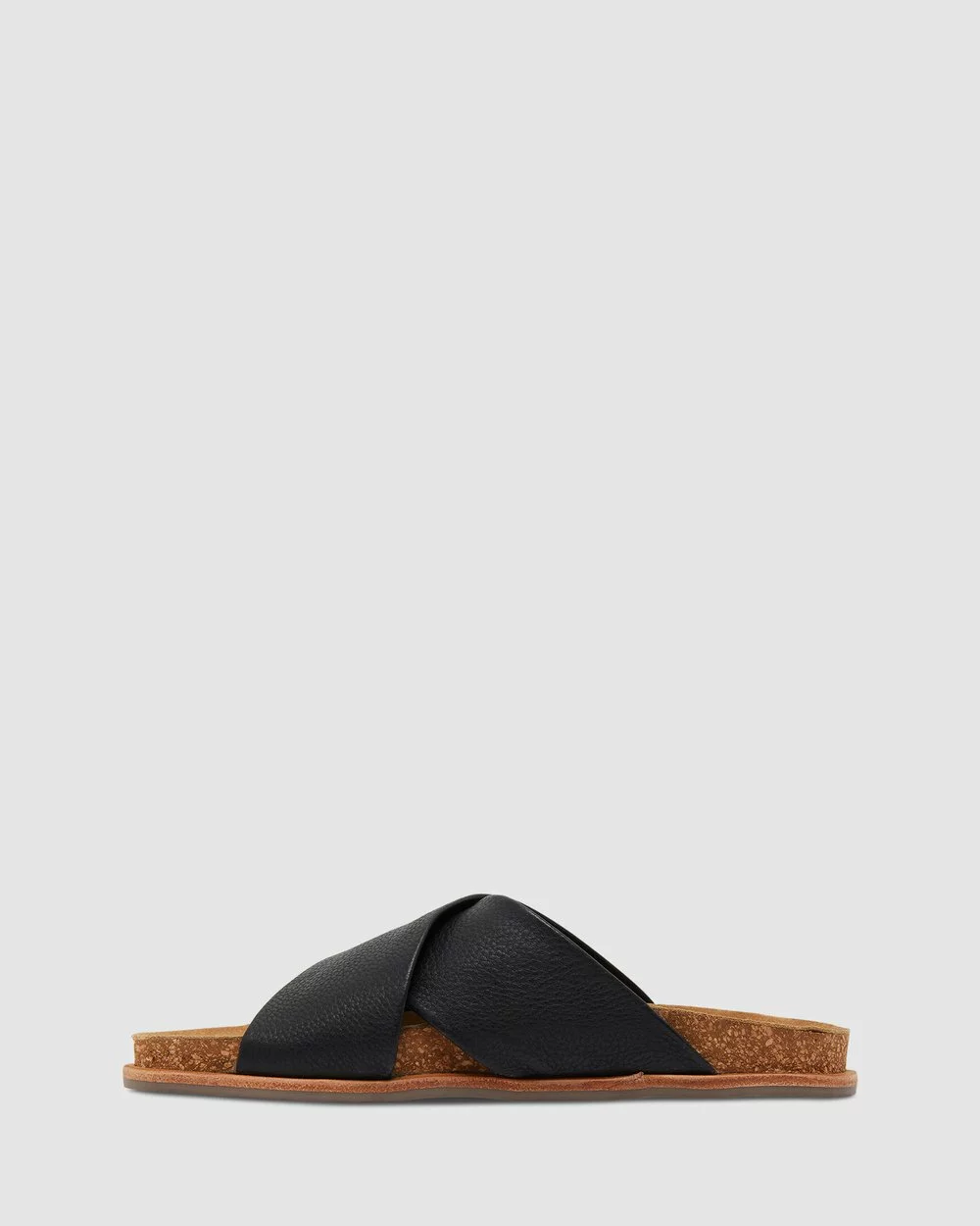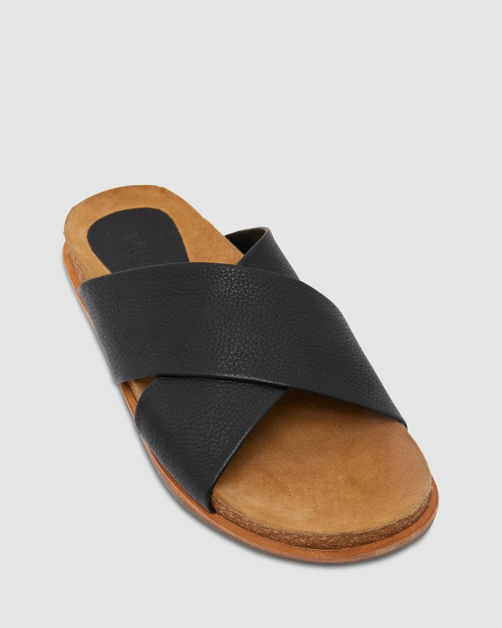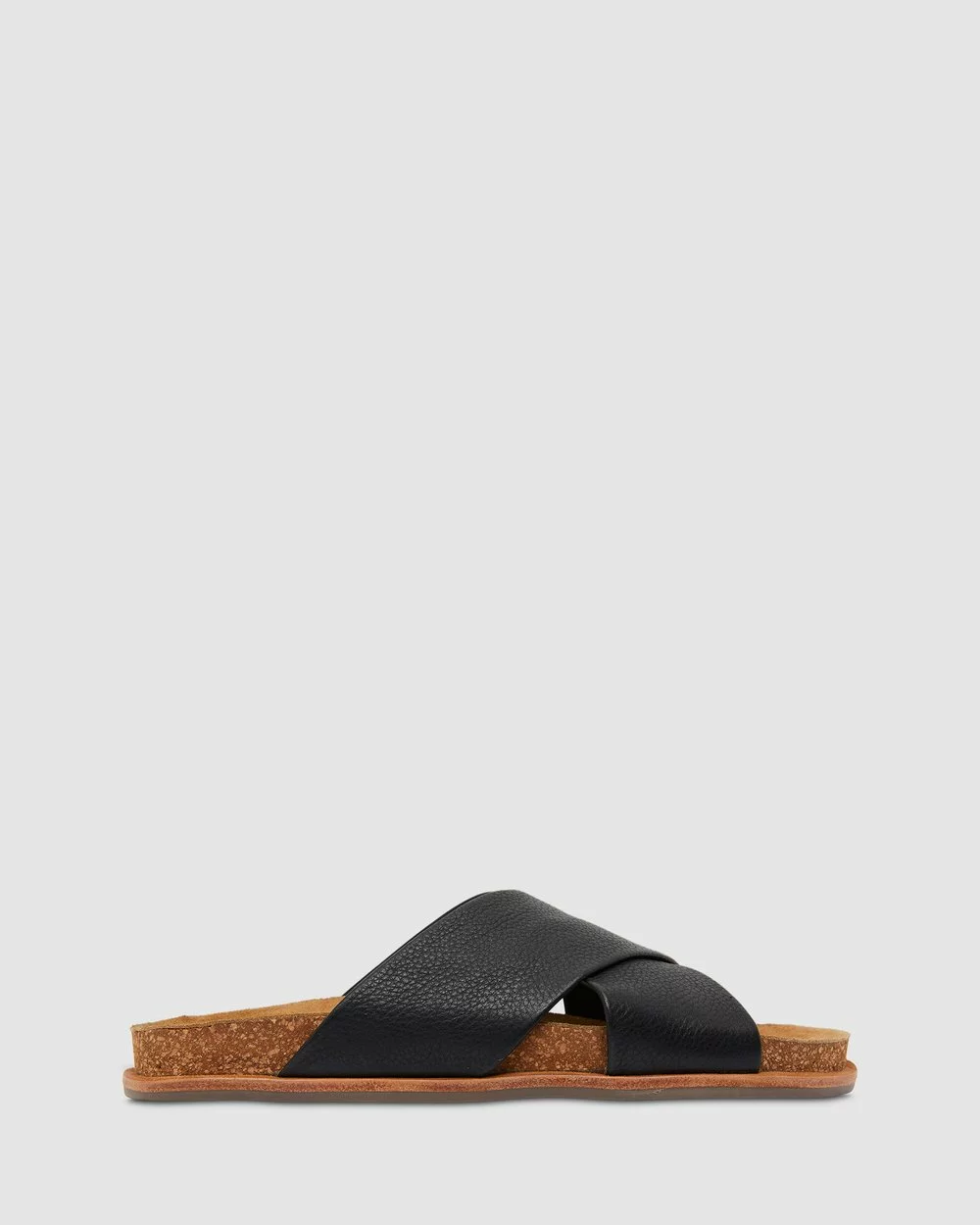 The Elka slides by Urge Footwear offer style and comfort. Sitting on a handmade molded cork footbed, these suede slides features a crossover design.