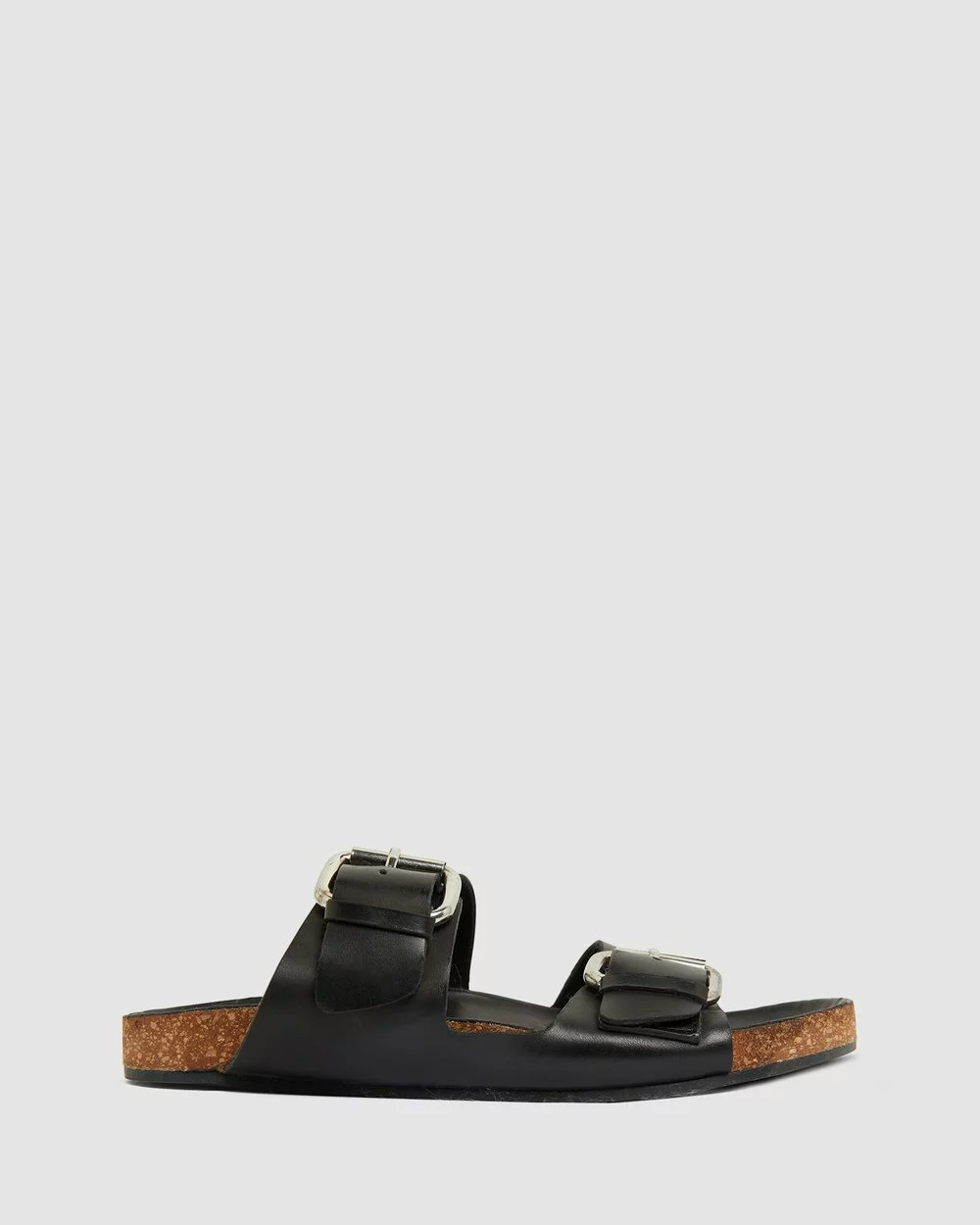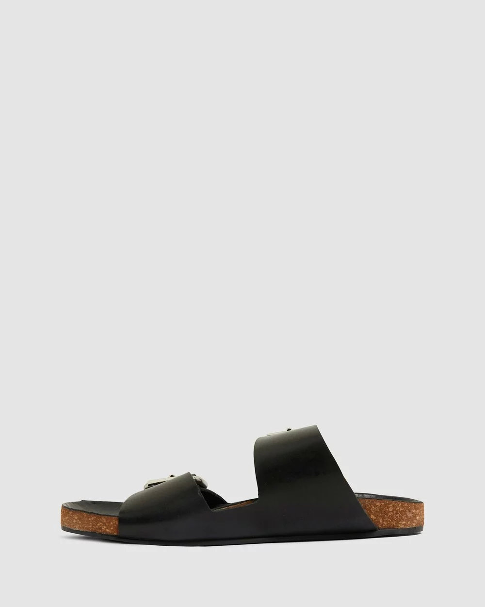 The Tayla slides by Urge Footwear offer style and comfort. Made with black oily leather, this slide has a two band upper with large silver buckles which allow you to easily adjust your best fitting. It sits comfortably on a molded cork foot bed, lined with a matching oily leather insole.