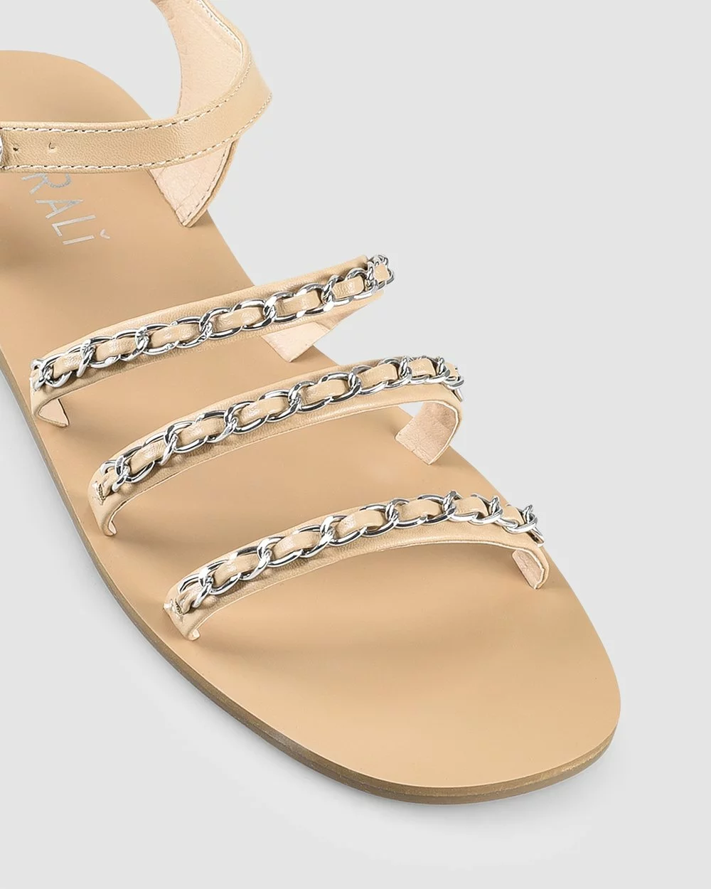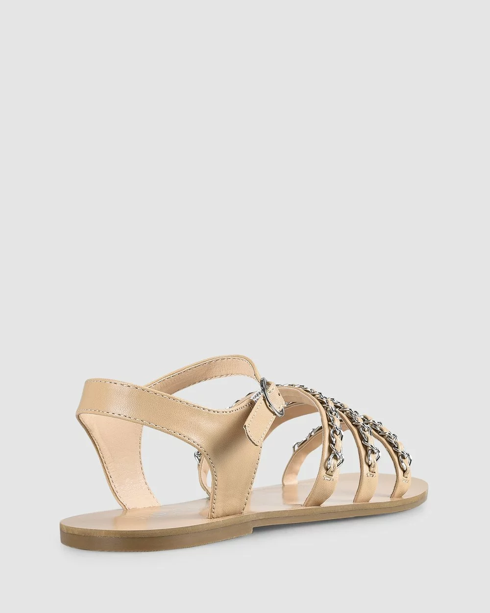 – Features: Chain detail straps, circular silver buckle, flexible sole.