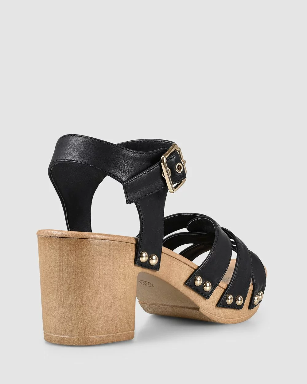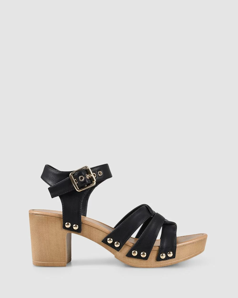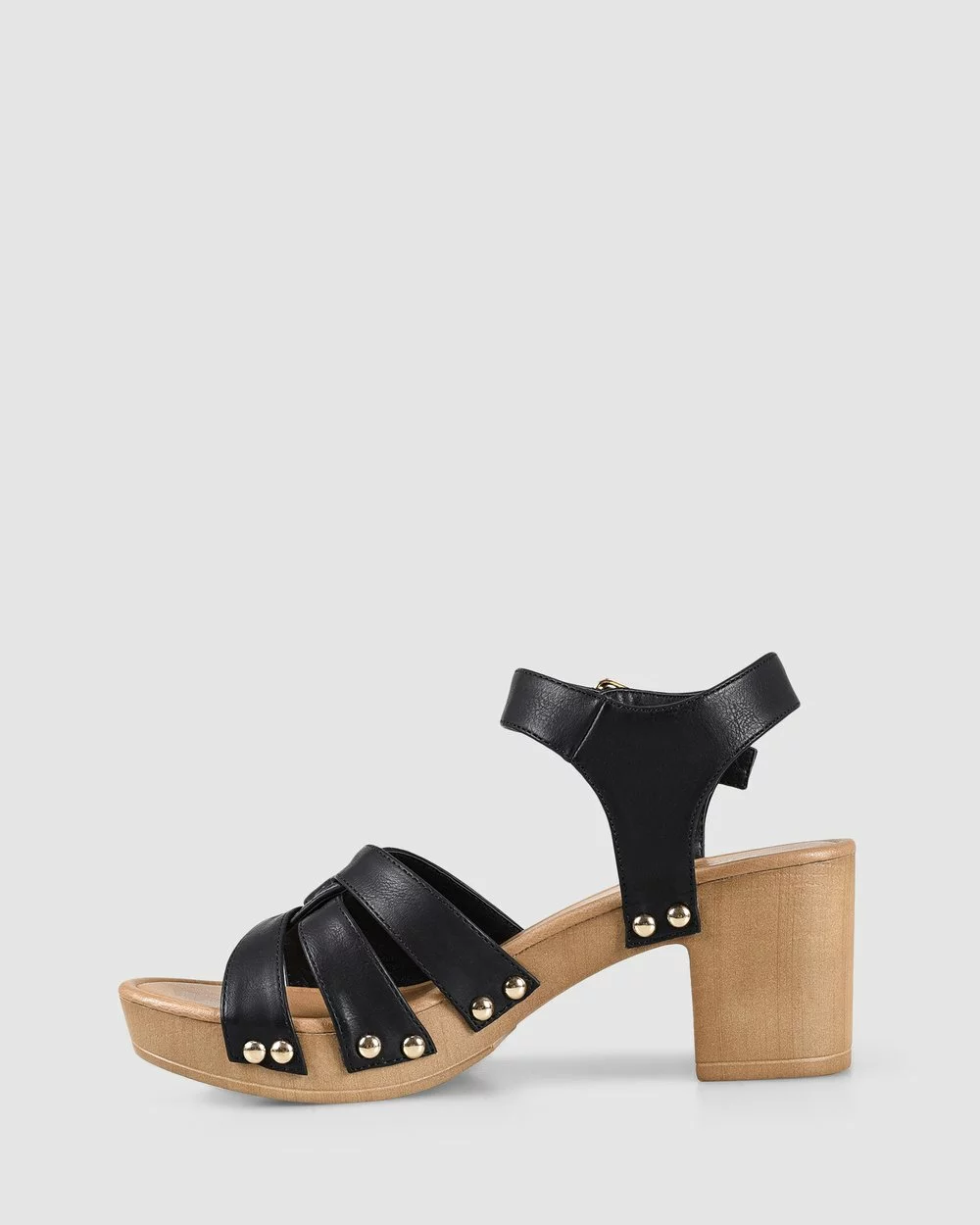 – Features: clog style wedge heel, gold press stud hardware, gold eyelets, woven upper straps.
