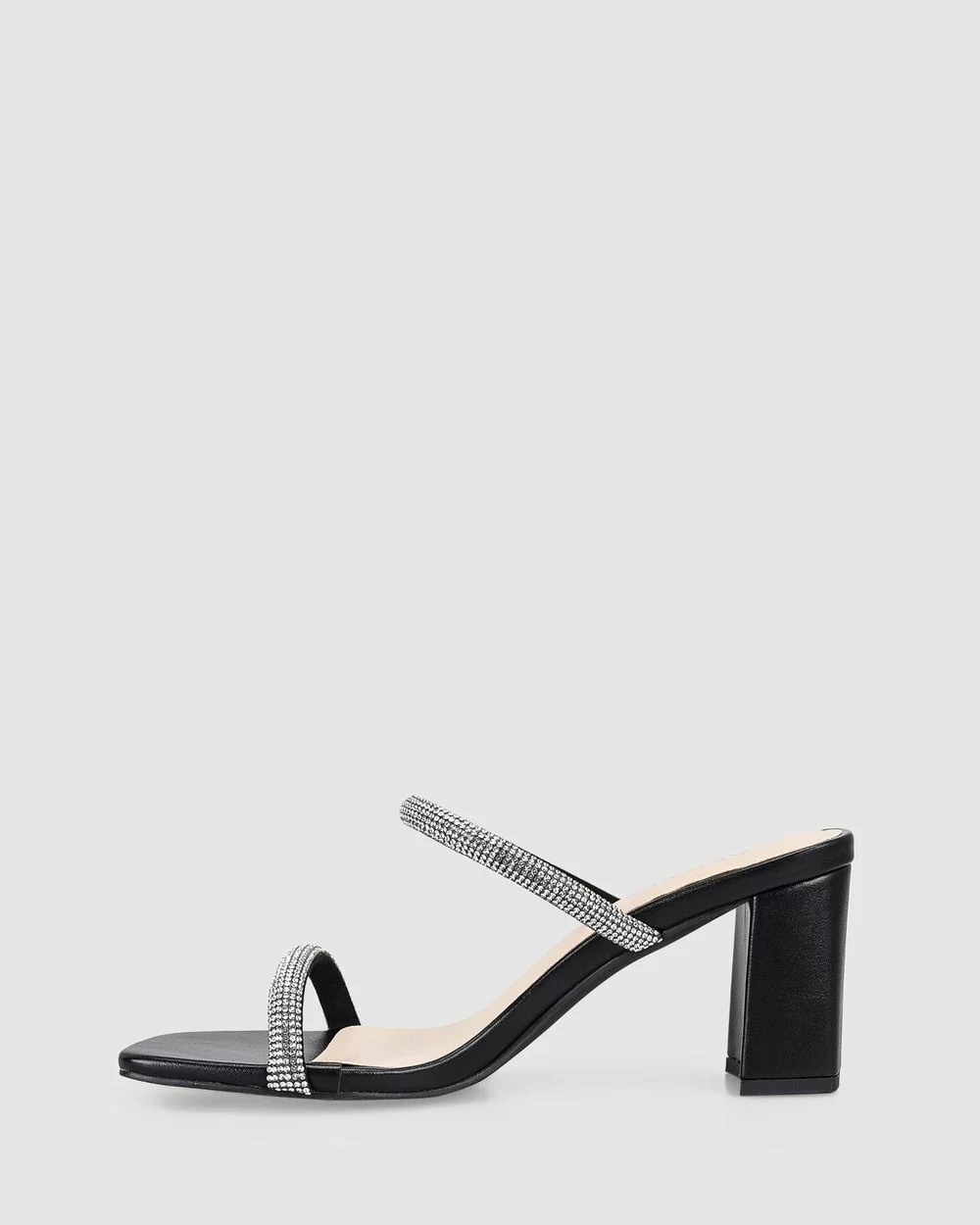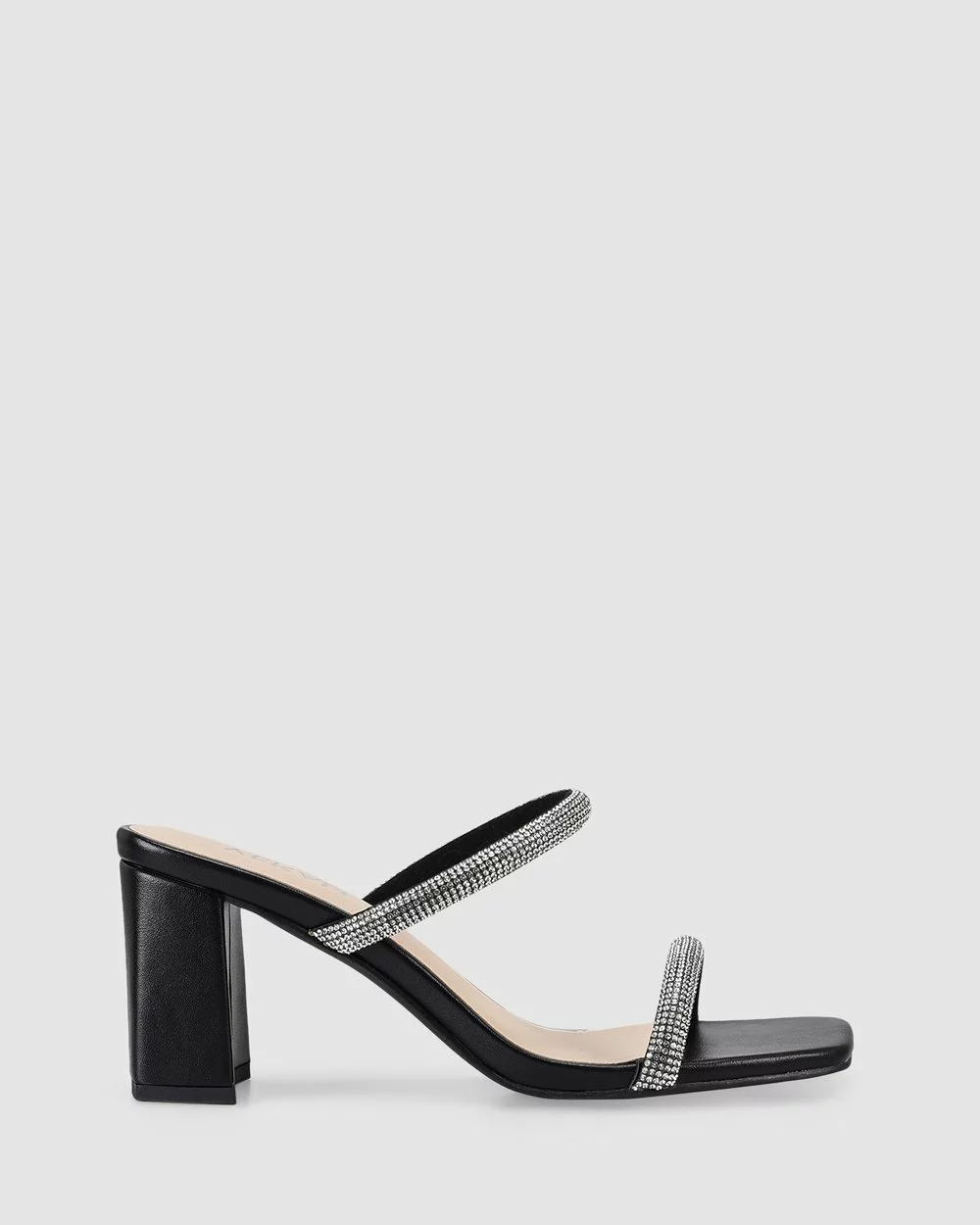 – Features: Diamonte covered double strap design, softly squared toe shape & padded insole.