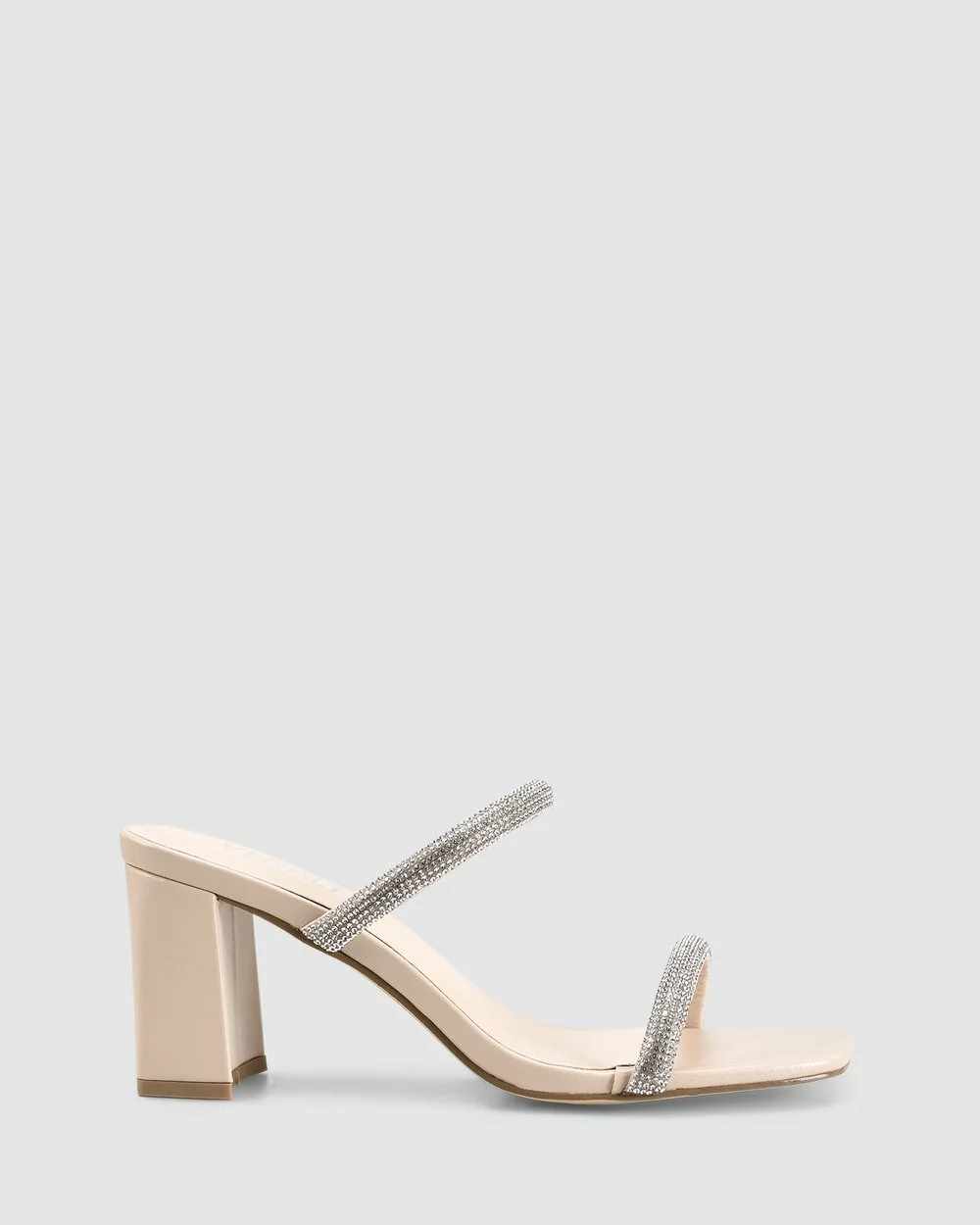 – Features: Diamonte covered double strap design, softly squared toe shape & padded insole.