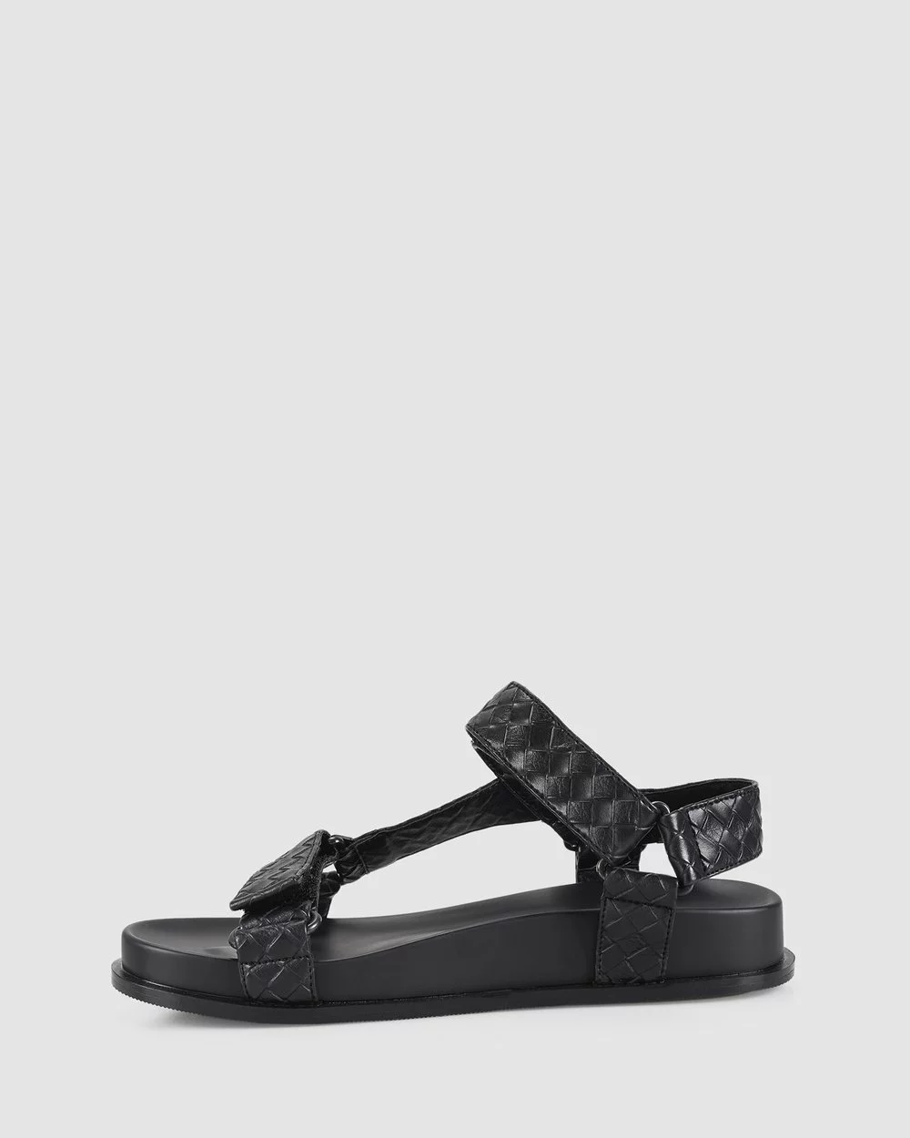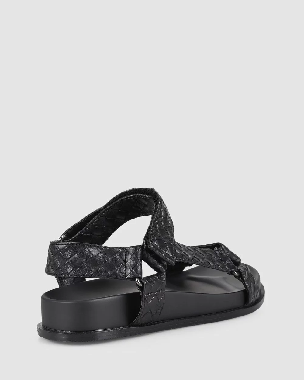 Features: padded foot bed, double strap upper with asymmetric linking strap, lightweight design, woven style.