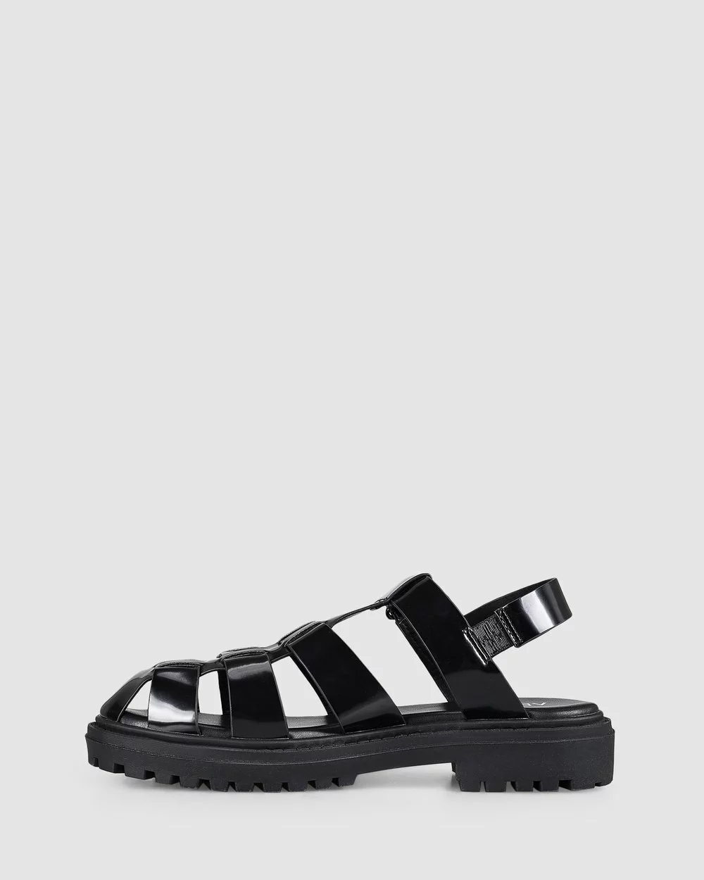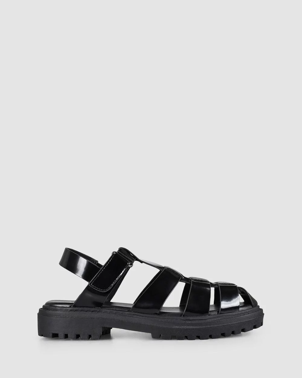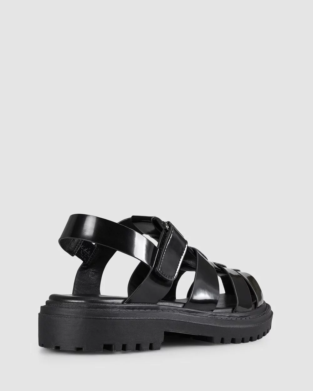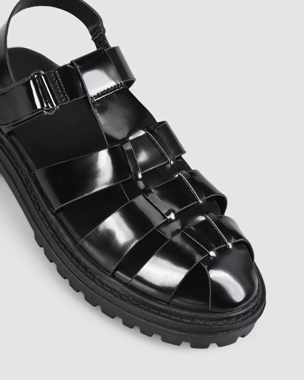 Features: High shine upper, caged design, chunky track sole & velcro ankle straps.
