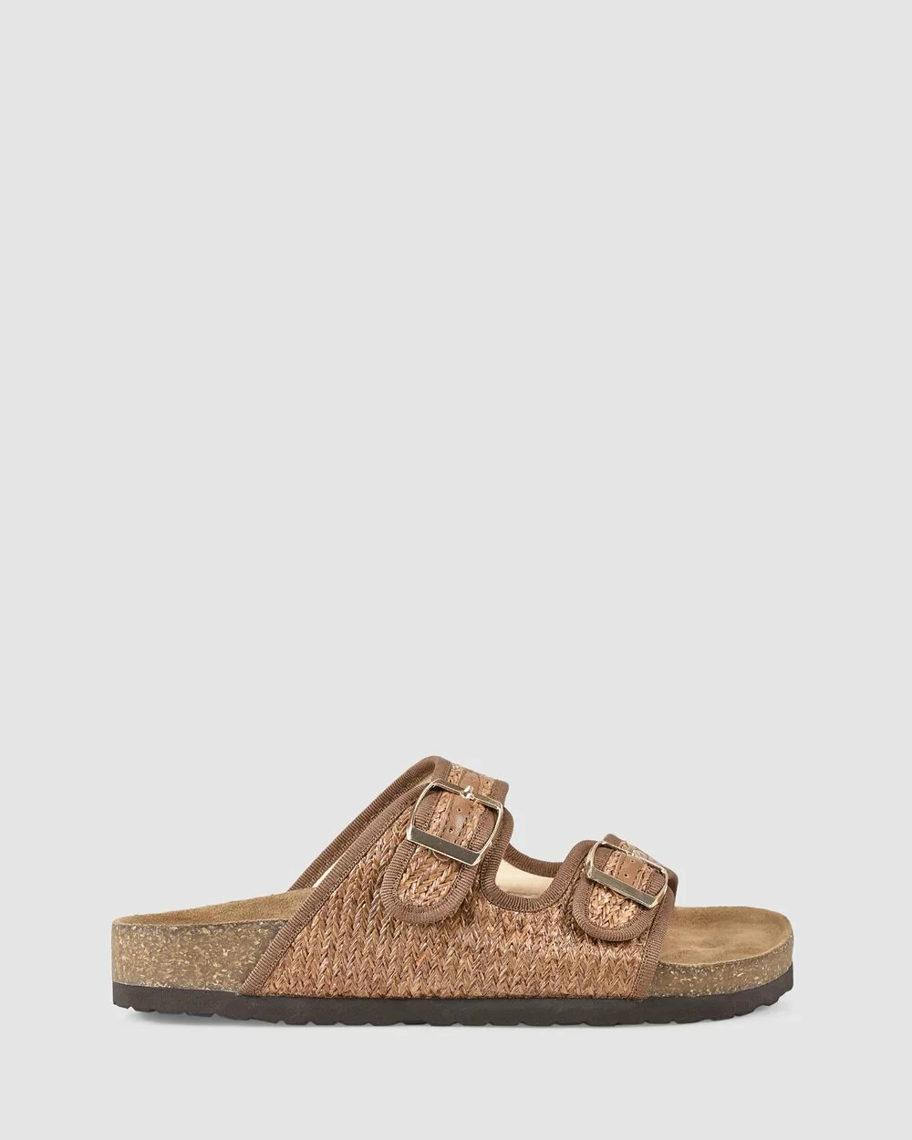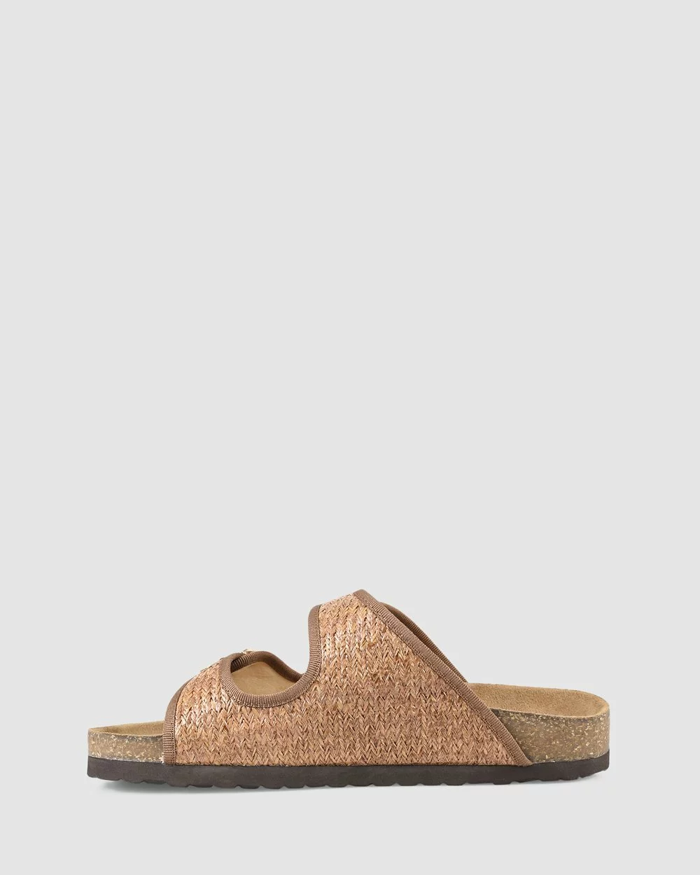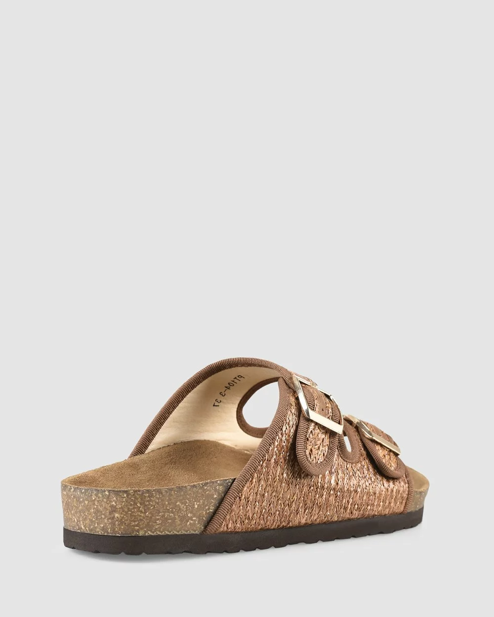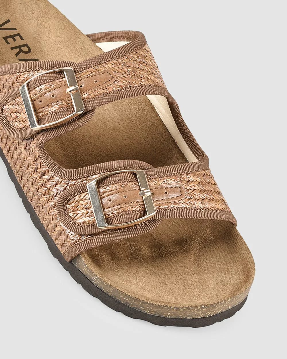– Features: Padded foot bed, light EVA sole, two strap design crafted in woven raffia, adjustable metal buckles.