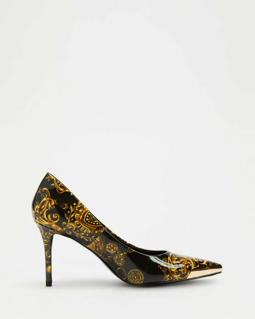 Update your footwear collection with the Logo Print Heels from coveted designer Versace Jeans Couture. Exude a premium etiquette with the gold-toned Versace print on a sleek stiletto heel.