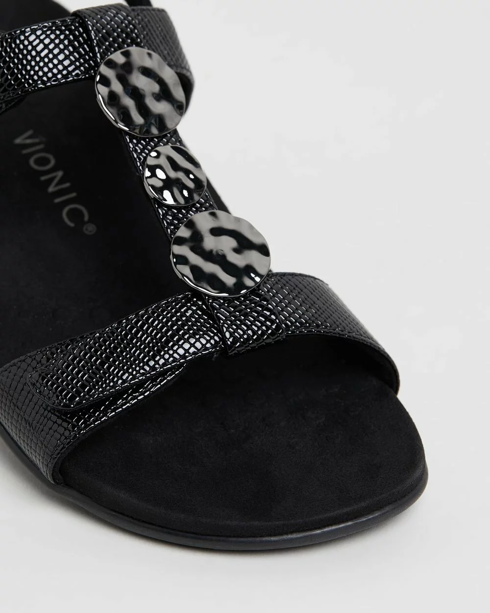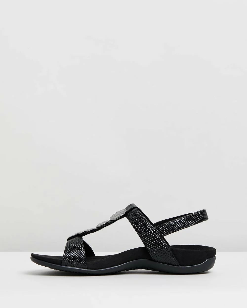 Vionic are revolutionising the footwear industry with their limitless innovation in footwear technology that never skimps on style — their Farra Backstrap Sandals are no exception with their moulded footbed, sleek t-bar design and hammered gunmetal disk accents.