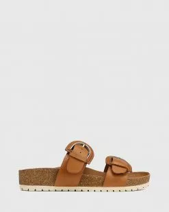 The Anaco Leather Double Strap Cork Slides by Wittner in tan feature gorgeous Spanish leather and a moulded double density foot bed.