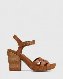 The Caliko Leather Block Heel Sandals by Wittner feature a unique strap design and a raw leather heel, creating a look perfect for warm nights.