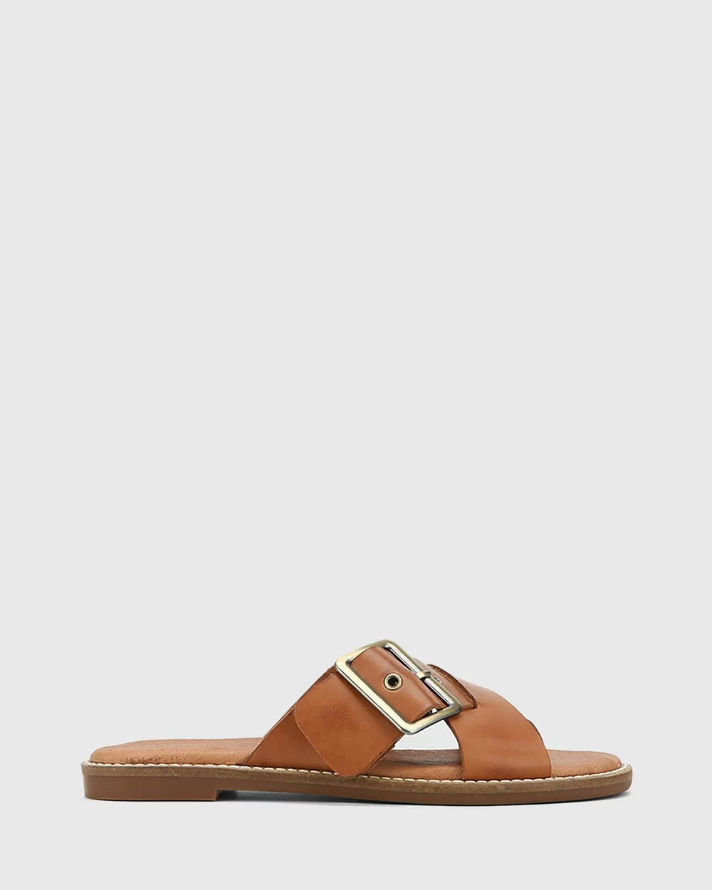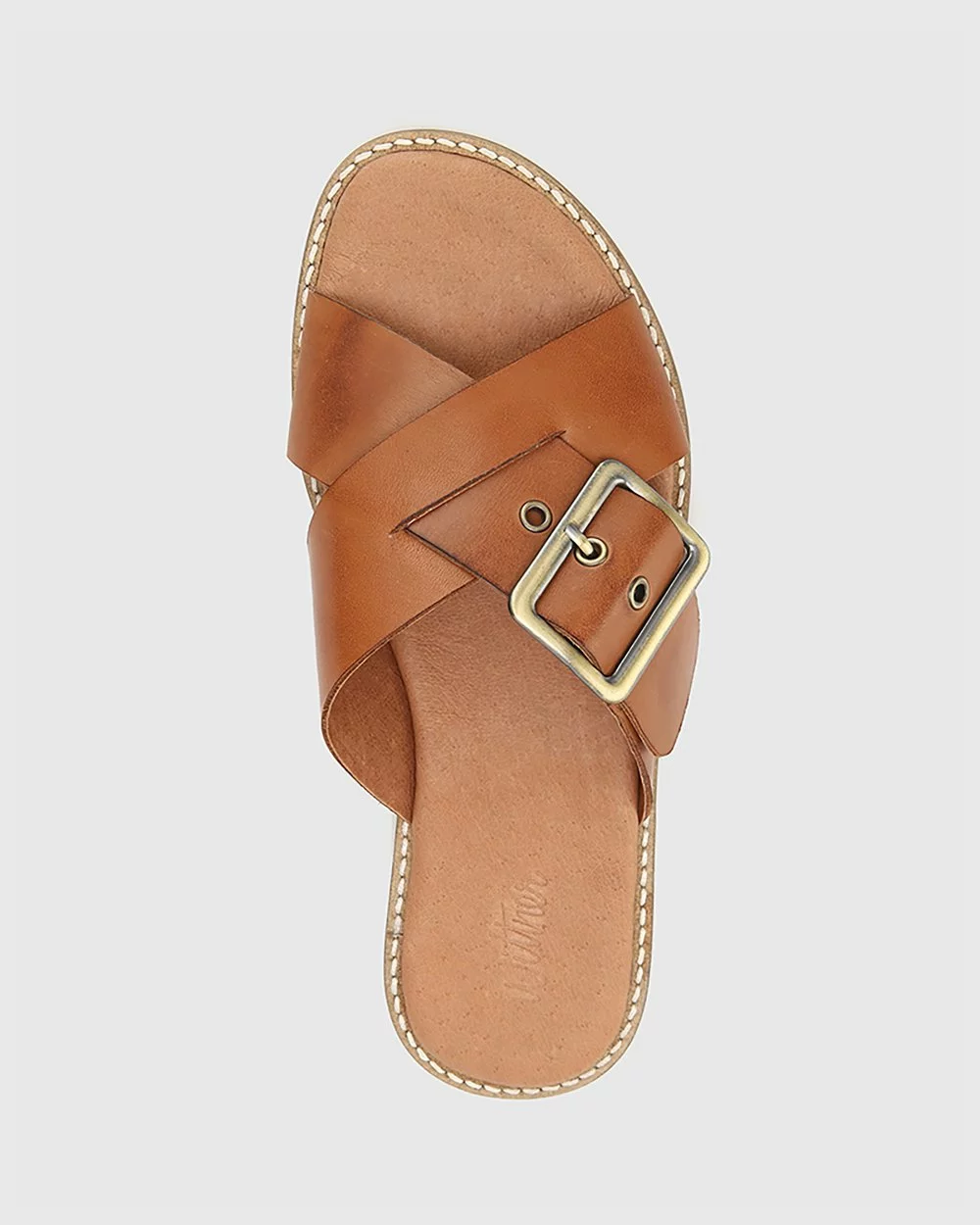 Elevate your street style with the Clooney Leather Crossed Strap Buckle Slides by Wittner. Brandy leather straps are accented with a stylish gold buckle. Slip them on with a linen shorts or a playsuit.