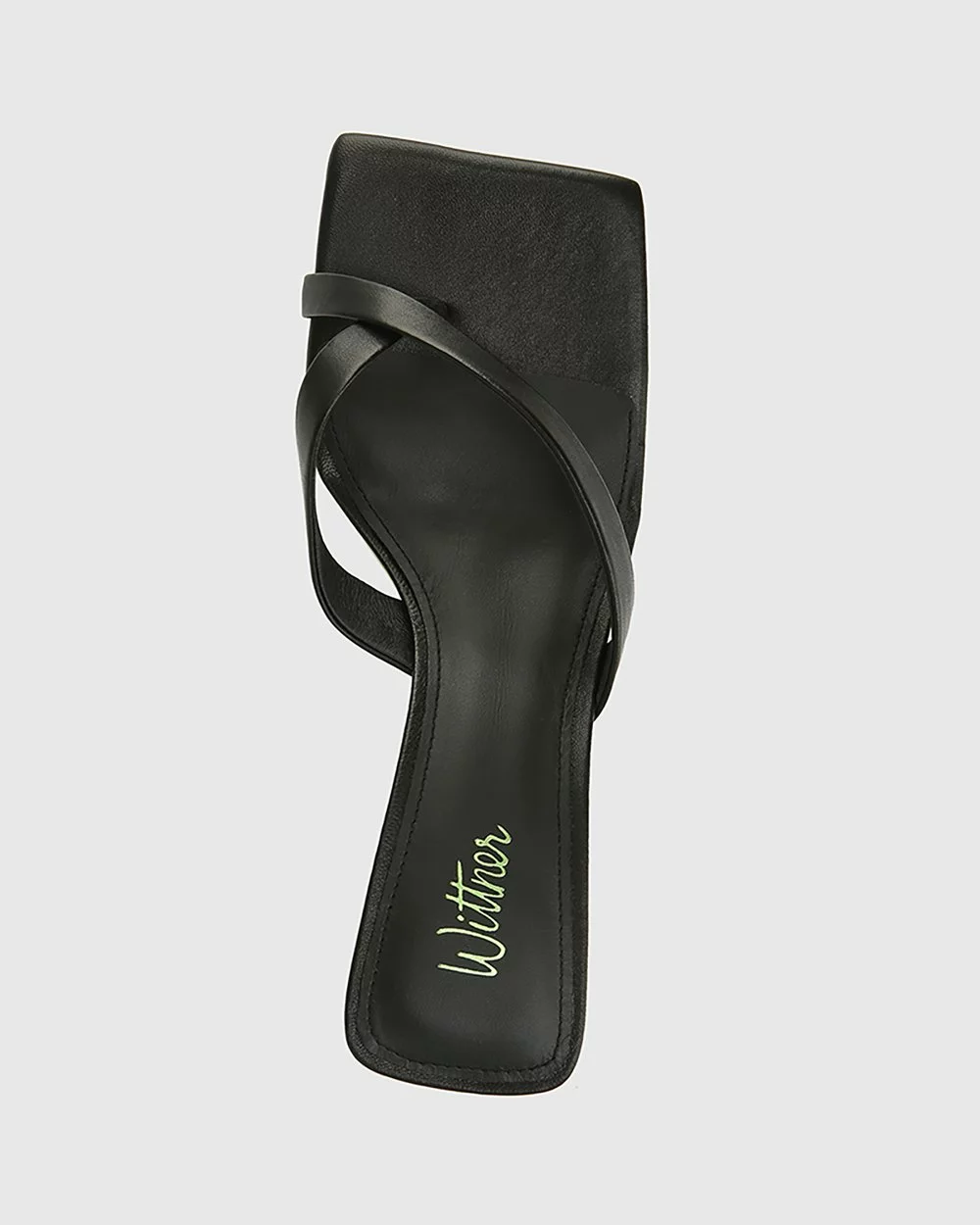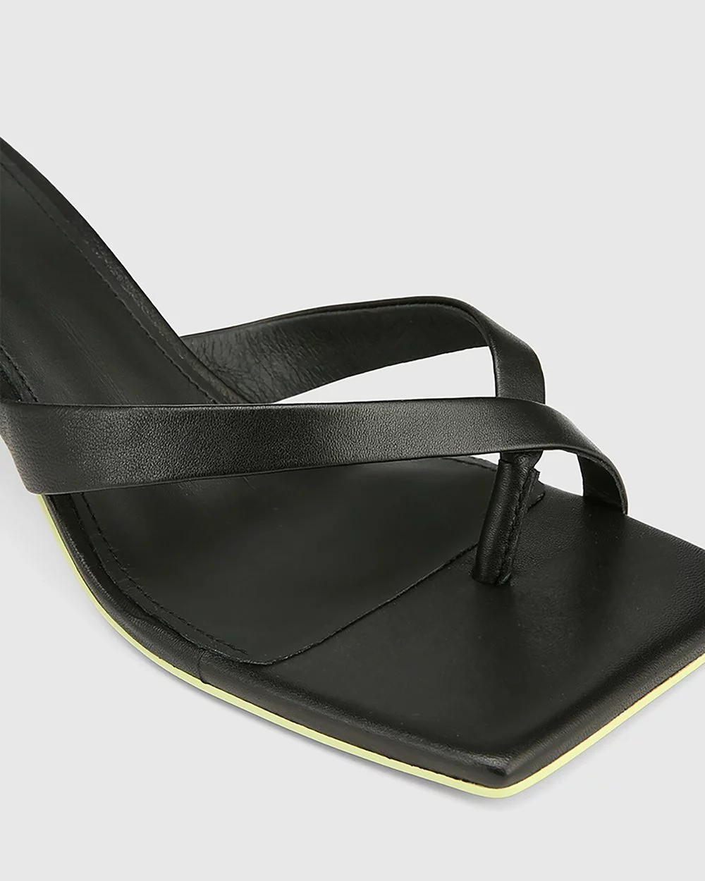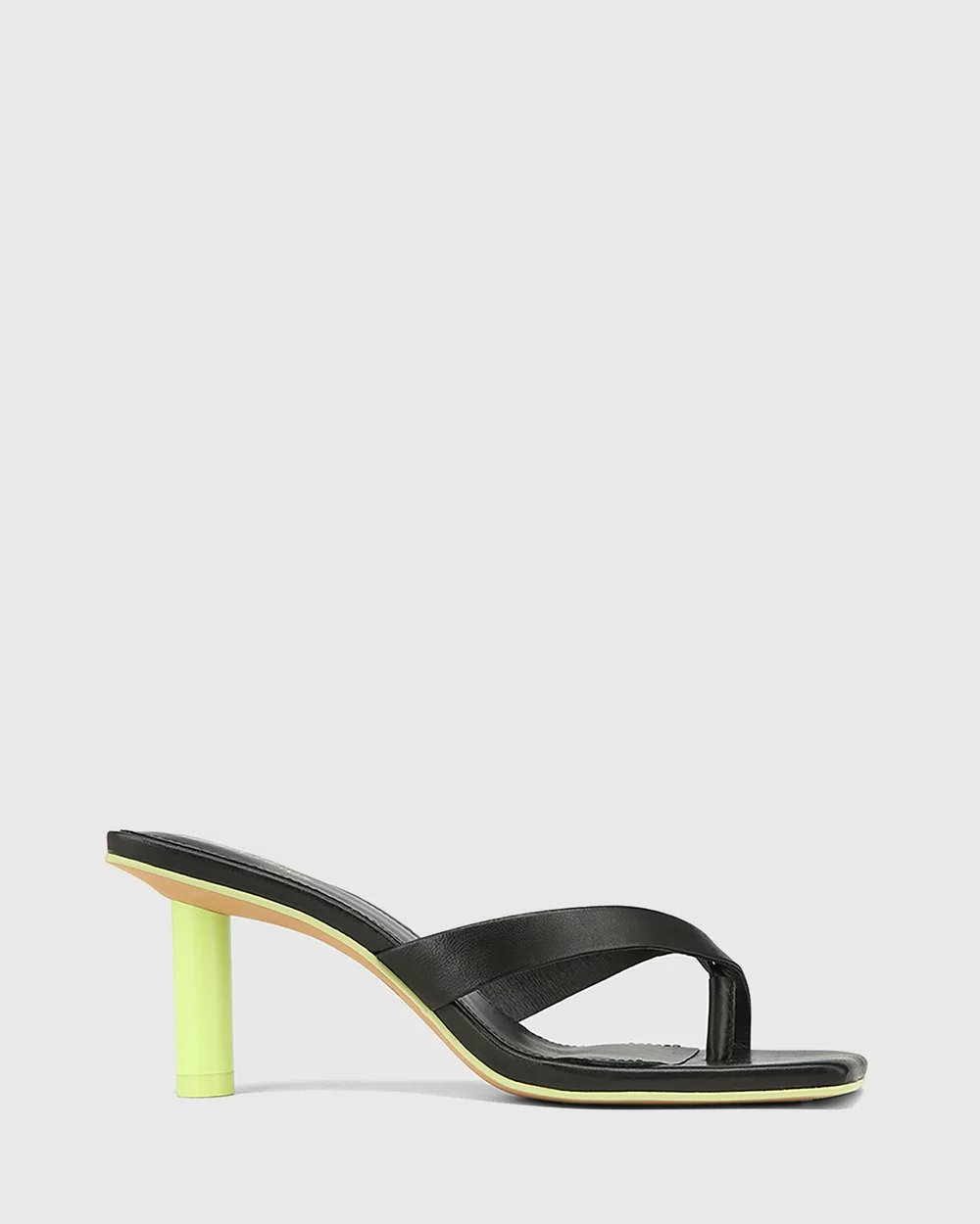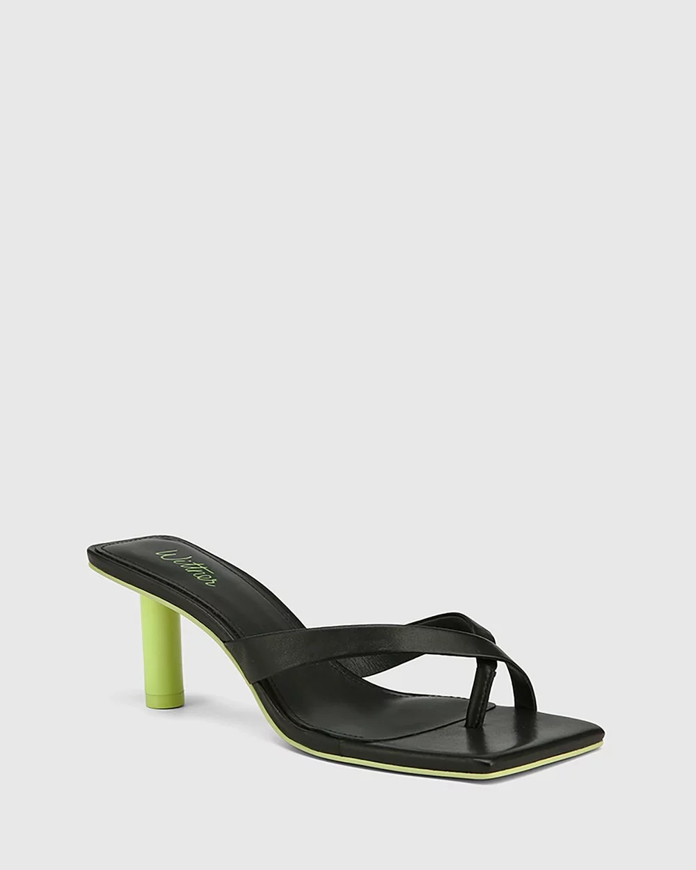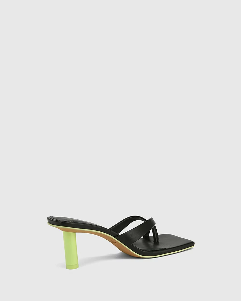 The Kandie Leather Round Heel Square Toe Sandals by Wittner in black leather is this summer’s style for the fashion-obsessed! Featuring an exaggerated square toe and thong straps, the black leather contrasts with a neon green cylinder heel.