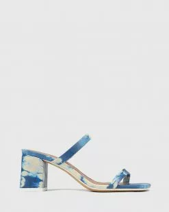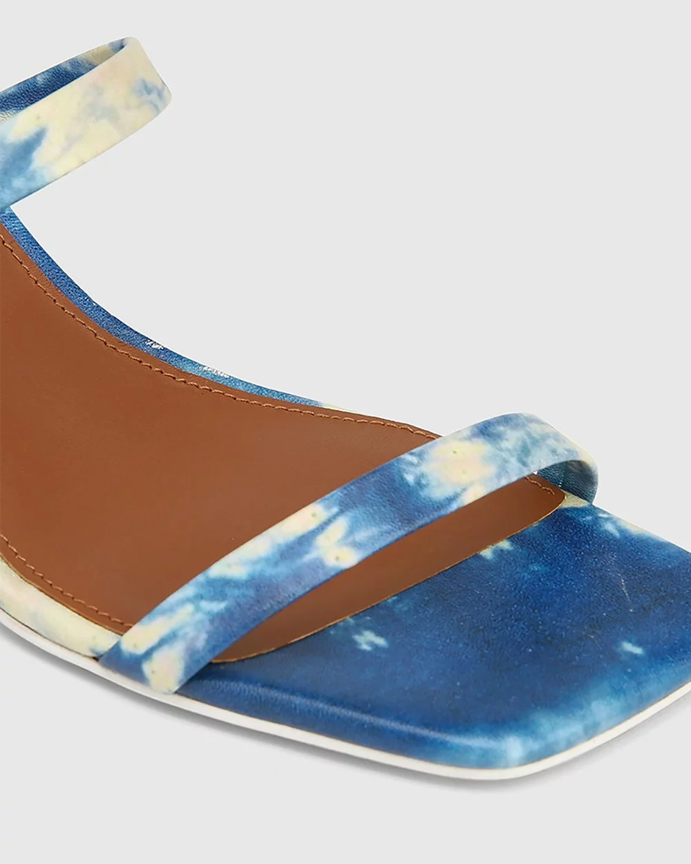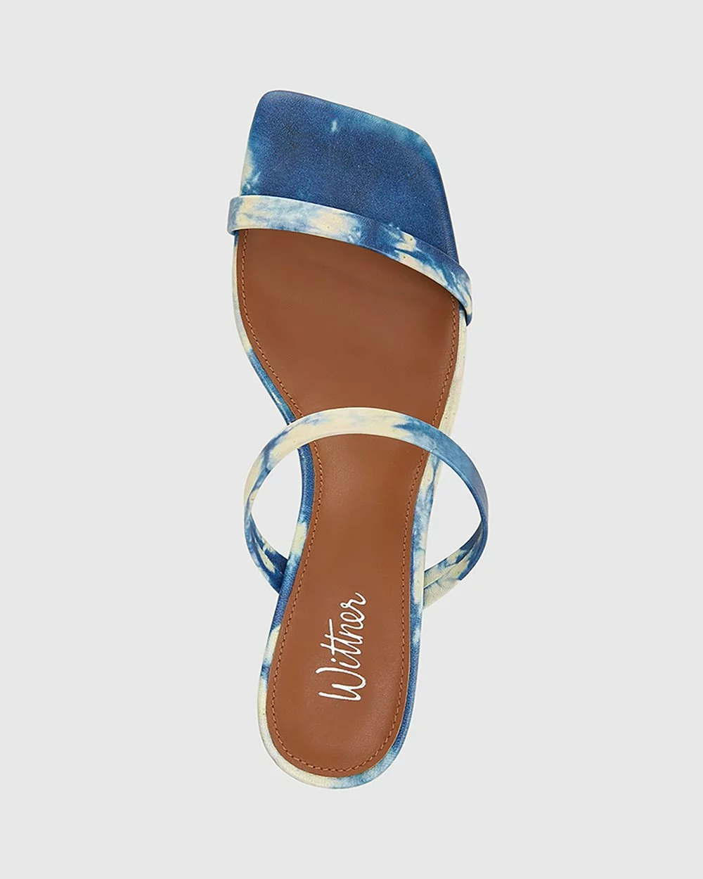 Minimalist sandals in a trending colour palette – the Kourtney Tie Dye Leather Block Heel Sandals by Wittner in tie-dye blue leather are this season’s must-have heel.
