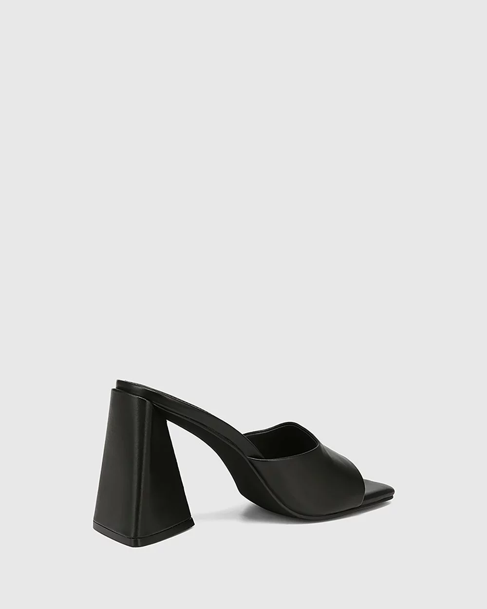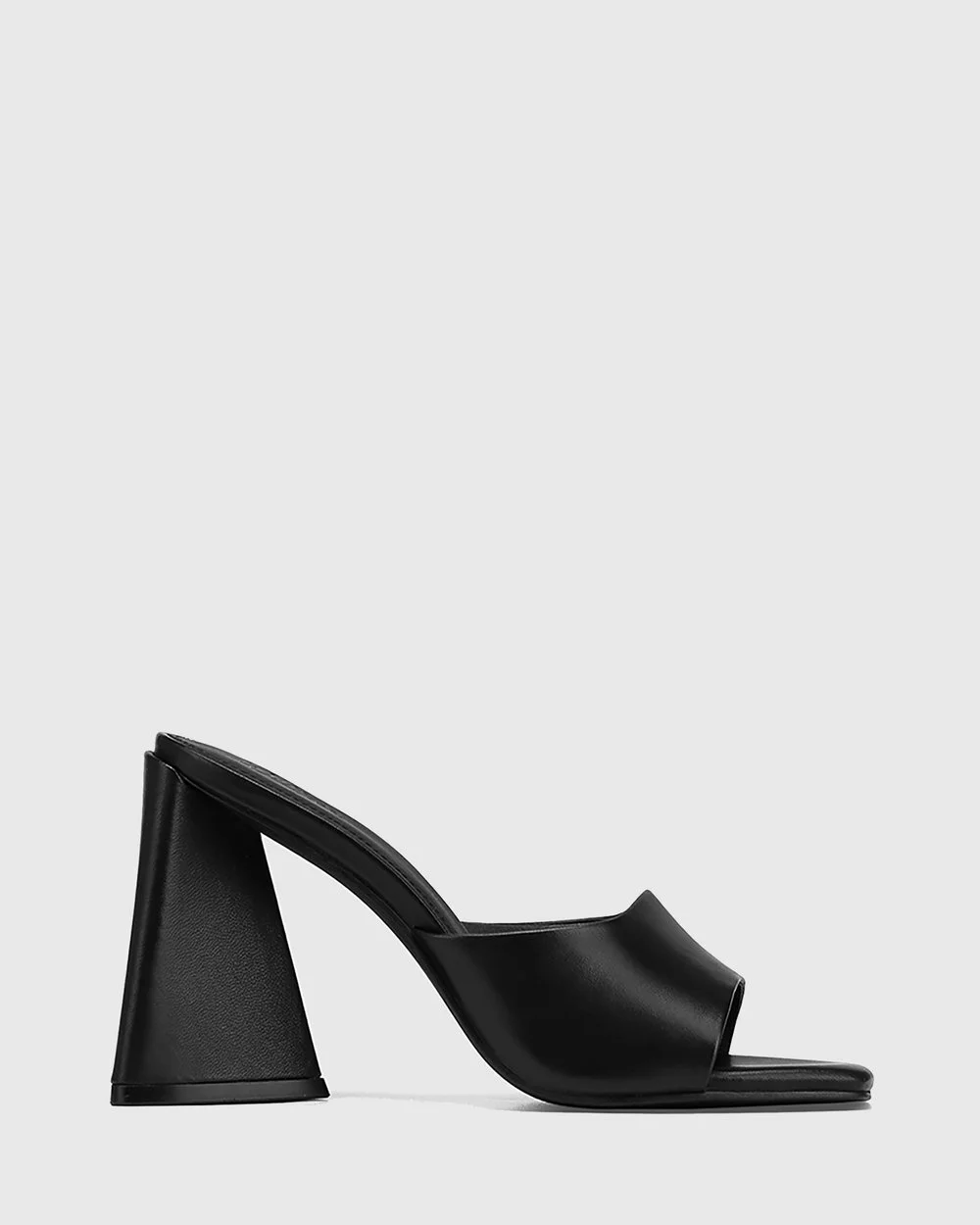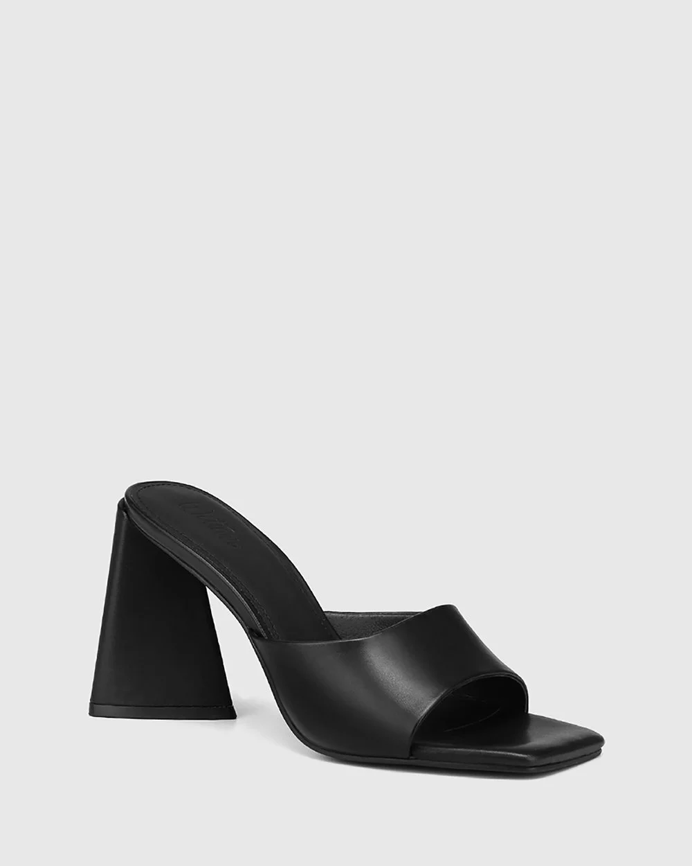 A black party sandal with elevated features, the Ralina Leather Angular Heel Sandals by Wittner feature a triangular heel and an open square toe.