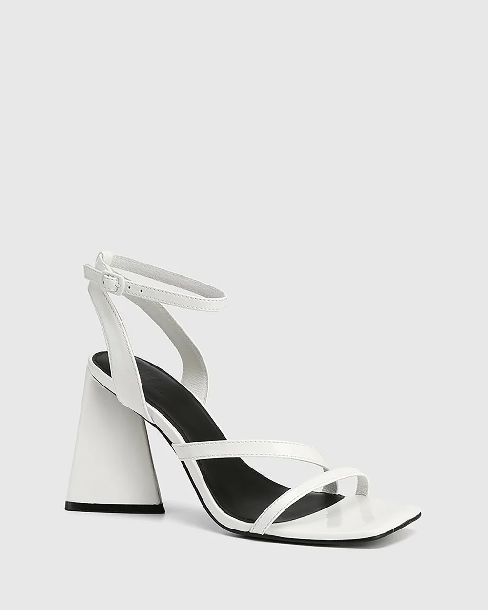 The Raychie Patent Leather Angular Heel Sandals by Wittner in white feature a chic triangular heel and fine leather straps that run up the foot.
