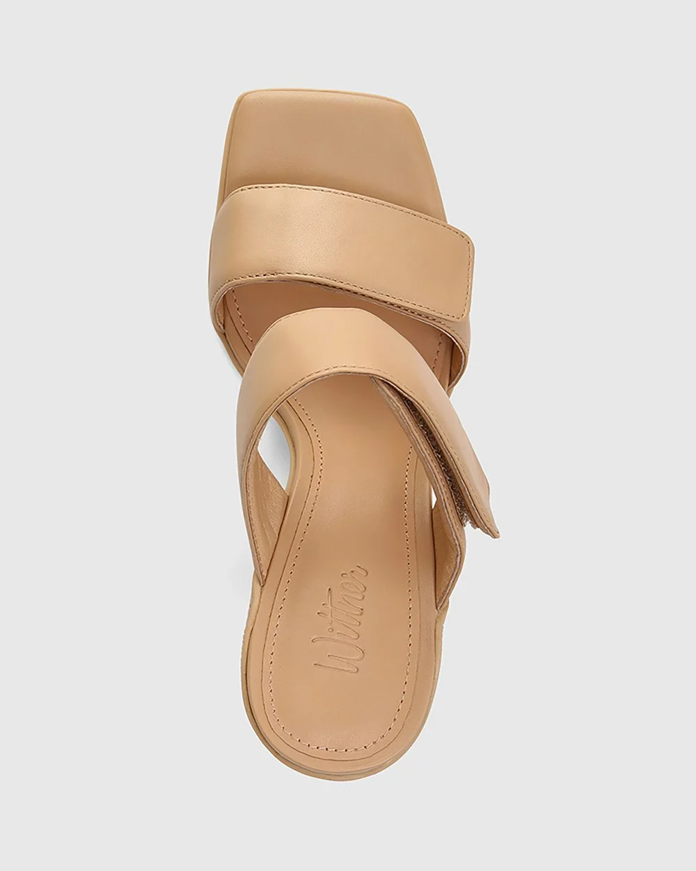 The Rexine Leather Stiletto Heel Sandals by Wittner feature velcro straps for ease of wear and a utility feel.
