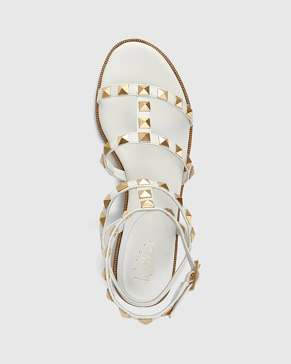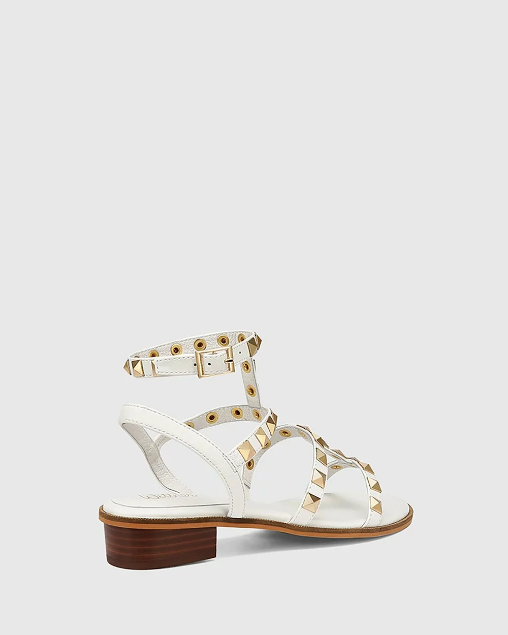 The Tahara Leather Stud Sandals by Wittner dazzle thanks to gold hardware and soft white leather.