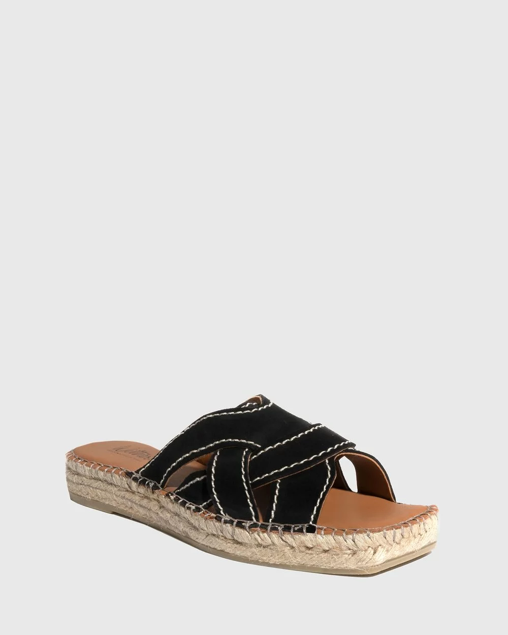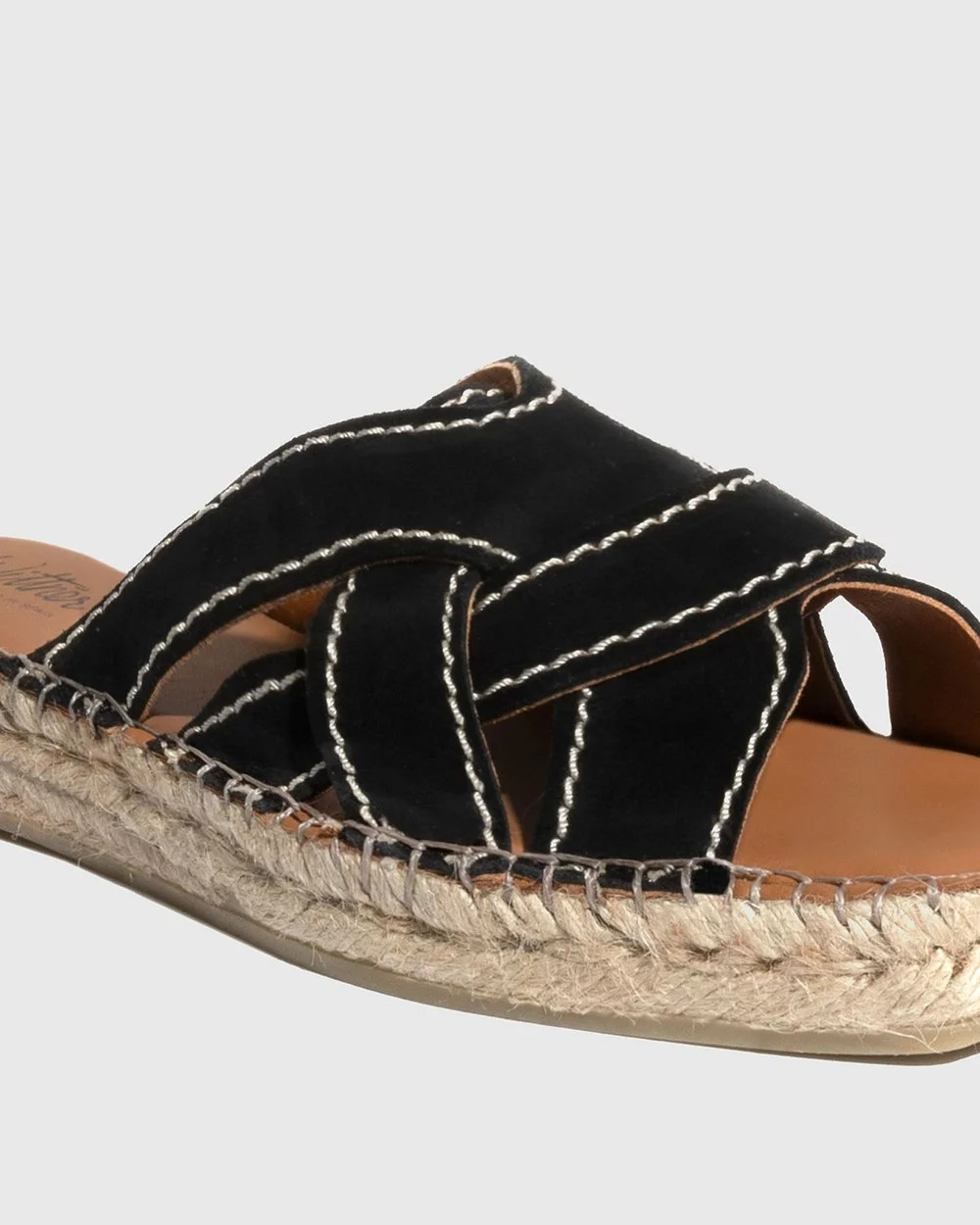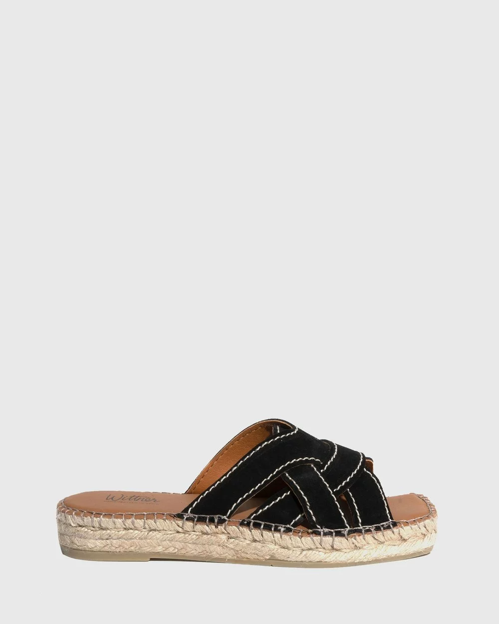 The Usko Suede Stitched Espadrille Slides by Wittner are a gorgeous flat style in soft black suede, set on top of an espadrille heel.