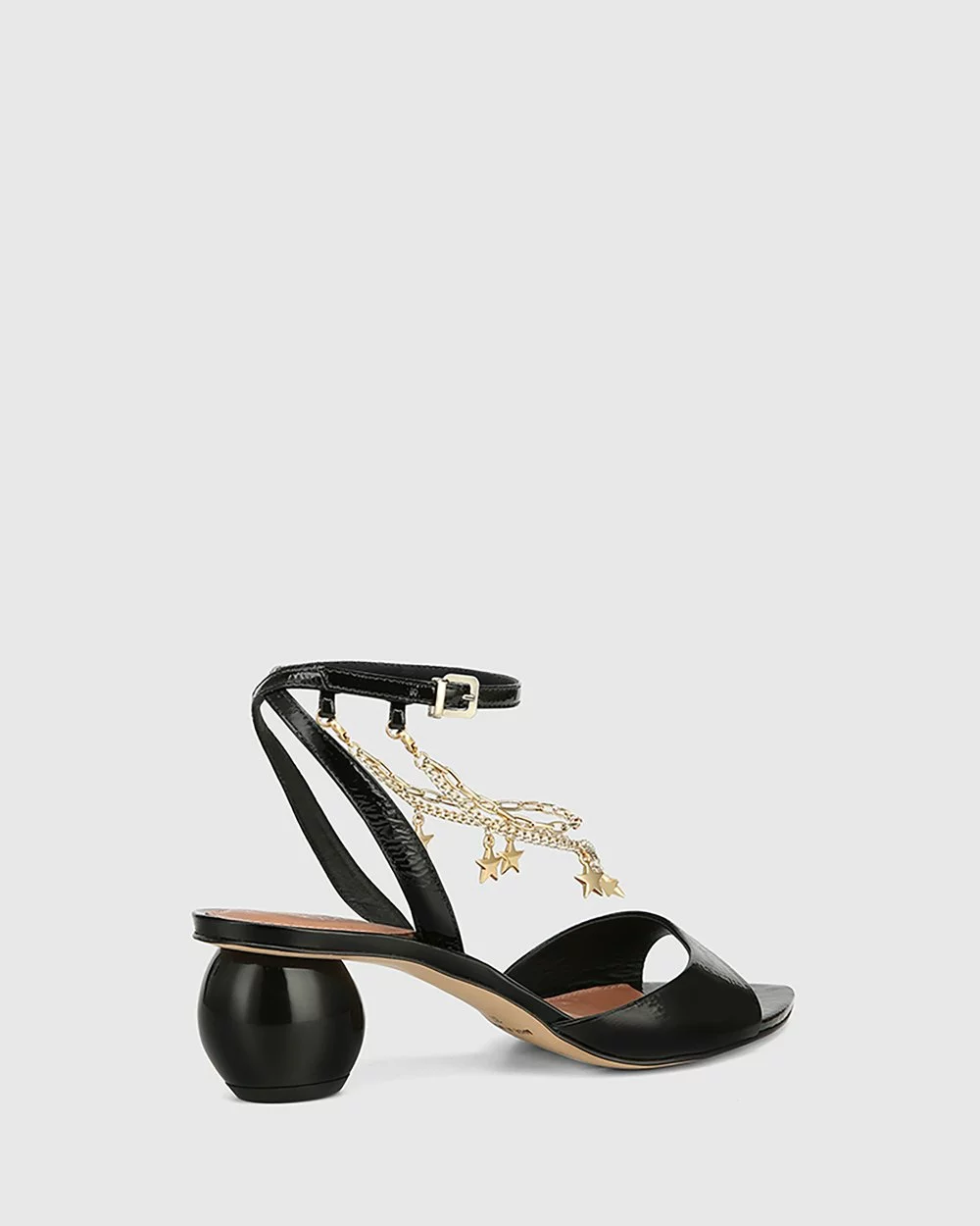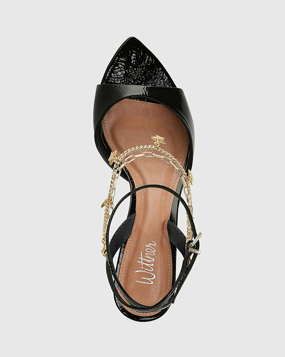 The Vanda Crinkled Patent Round Heel Sandals by Wittner in black feature an open pointed toe and a unique round heel with a delicate strap that runs up around the ankle, adorned with star charms.
