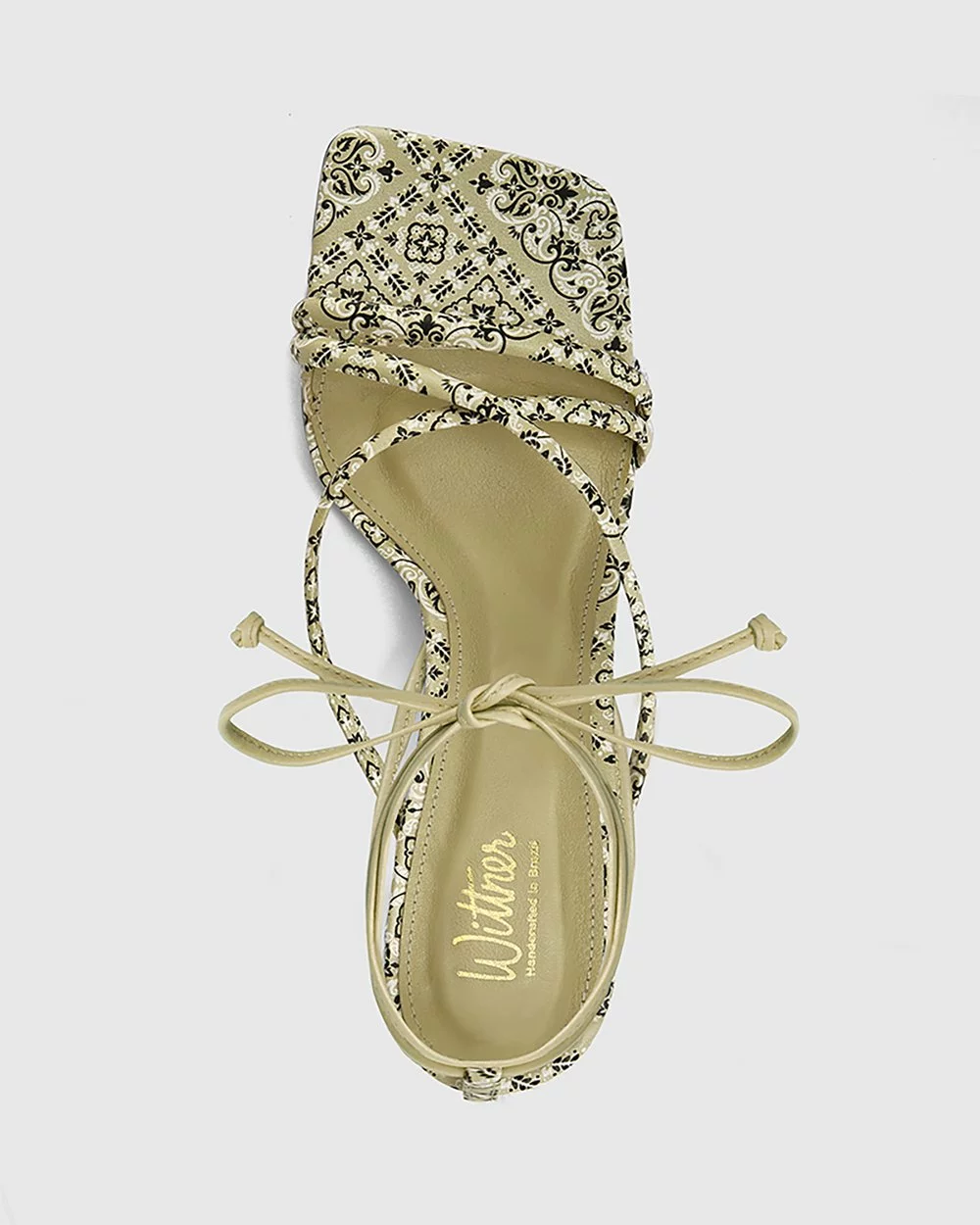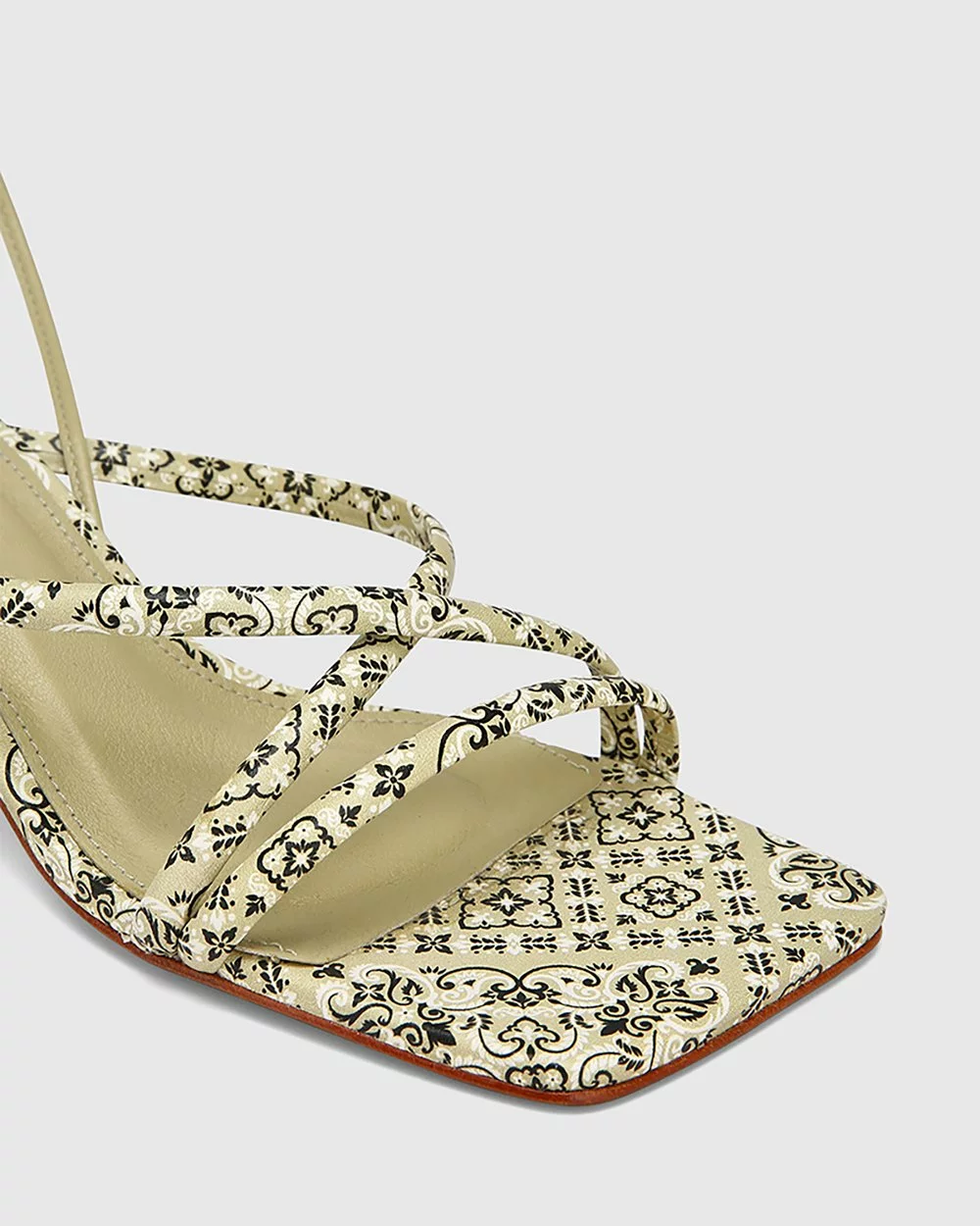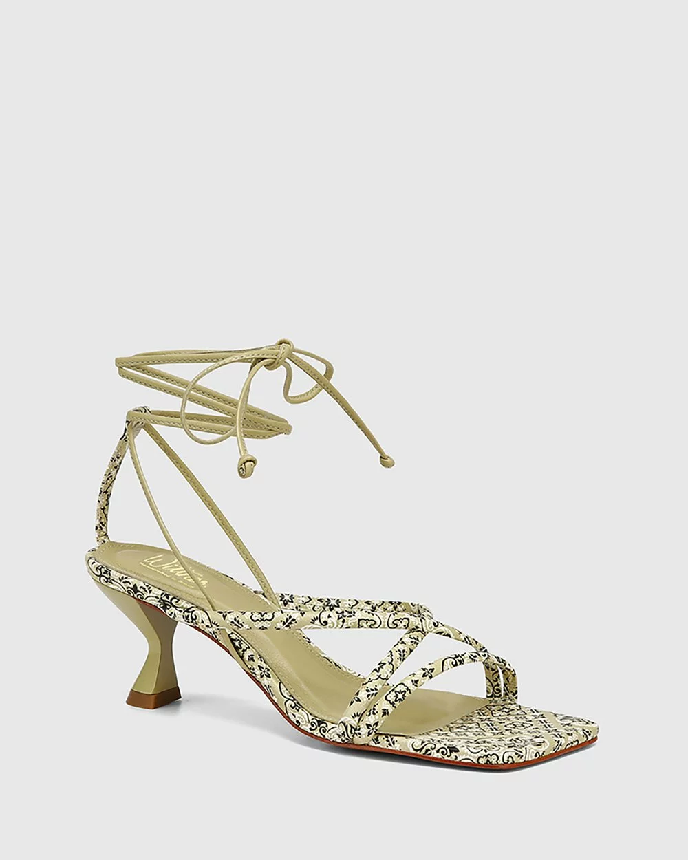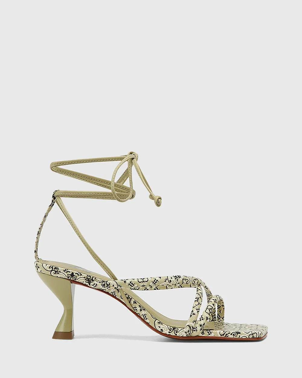 A mid-height heel in moss paisley leather – the Vela Leather Strappy Sandals by Wittner are a chic sandal with a curved heel.