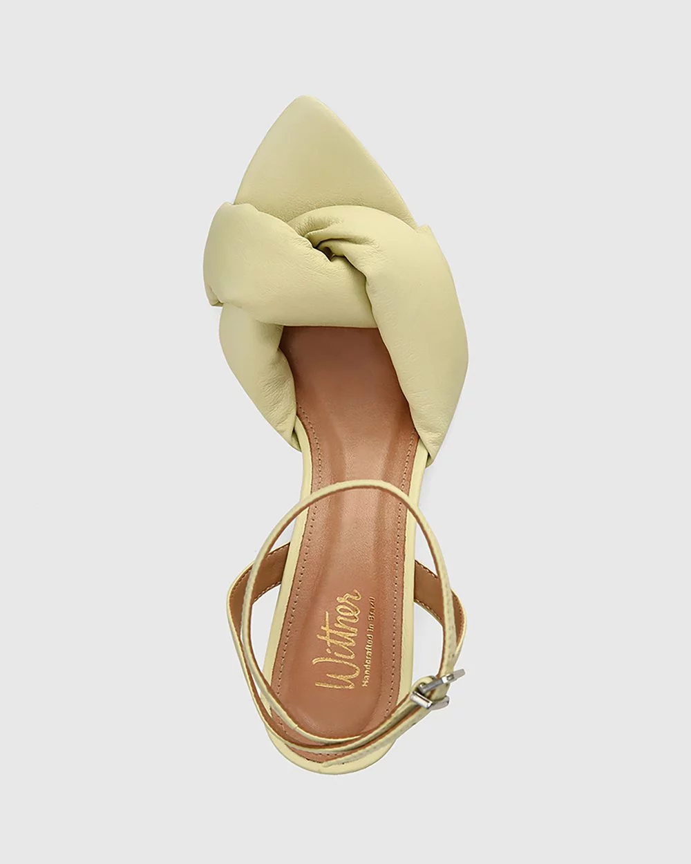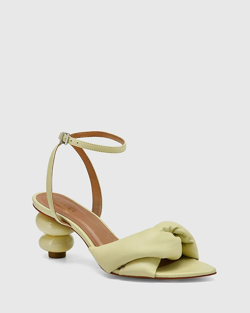 The Visser Leather Round Sculptured Heel Sandals by Wittner in mint green sit on a stylish curved sculptural heel and feature a soft padded leather strap.
